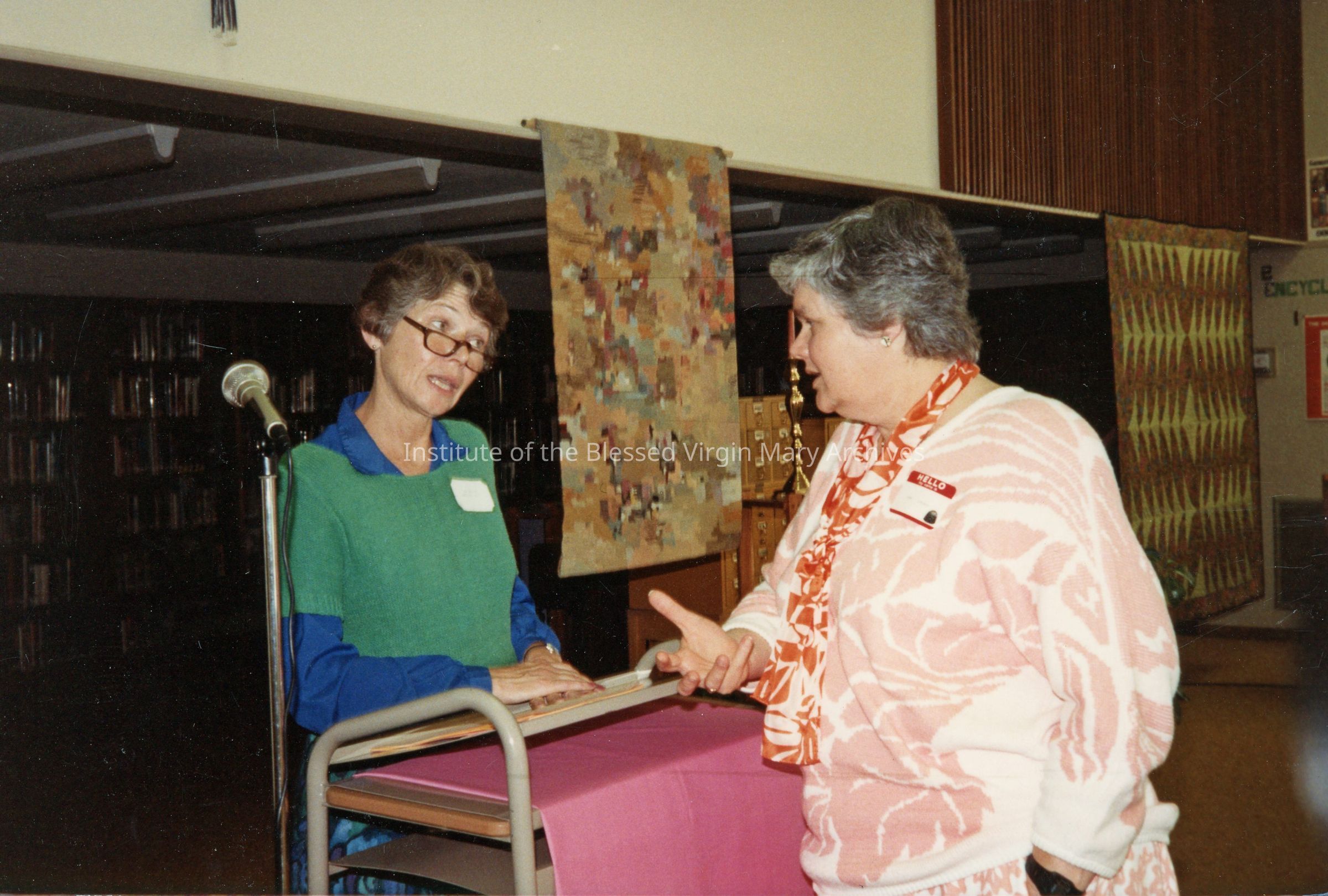 Meeting at Loretto High School in Sacramento, California. From left to right are Sister Christine Wombacher, O.P. and Sister Jean Frye. The event took place in the school's library.