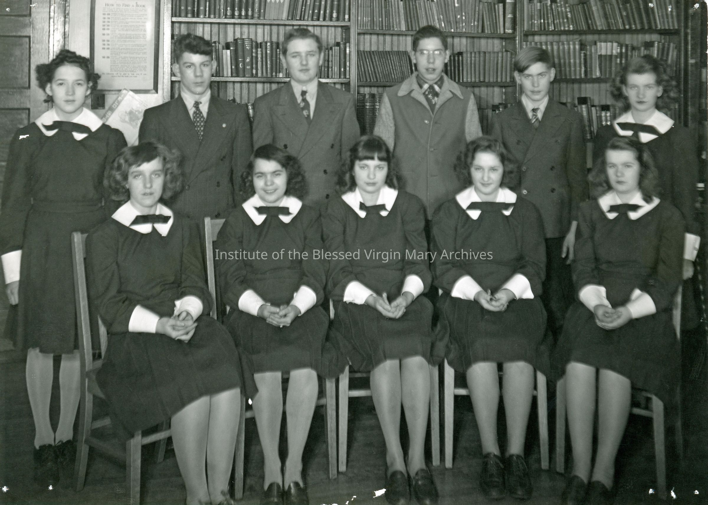 Students at Loretto High School, previously Loretto Academy, in Sault Ste. Marie, Michigan. The names June Ring, John Harns, Teresa Masta and Albert Massey appear on the back. Founded in 1896, the academy's location at 377 Armory Place (pictured) opened in 1899 and underwent a substantial addition in 1910. Converted into a co-ed high school in 1944, it was demolished in 1966 after Loretto Catholic Central High School was constructed.