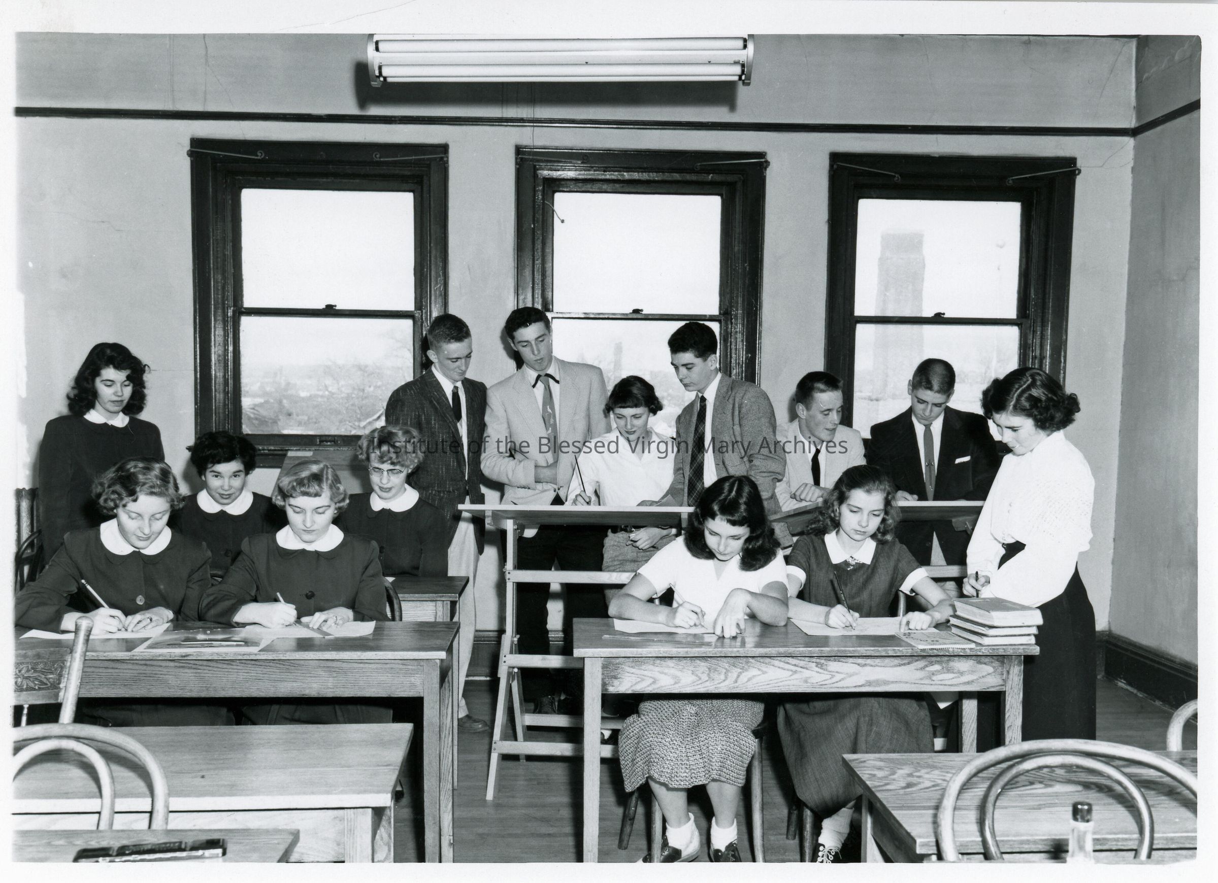 Students at Loretto High School, previously Loretto Academy, in Sault Ste. Marie, Michigan. Founded in 1896, the academy's location at 377 Armory Place (pictured) opened in 1899 and underwent a substantial addition in 1910. Converted into a co-ed high school in 1944, it was demolished in 1966 after Loretto Catholic Central High School was constructed.