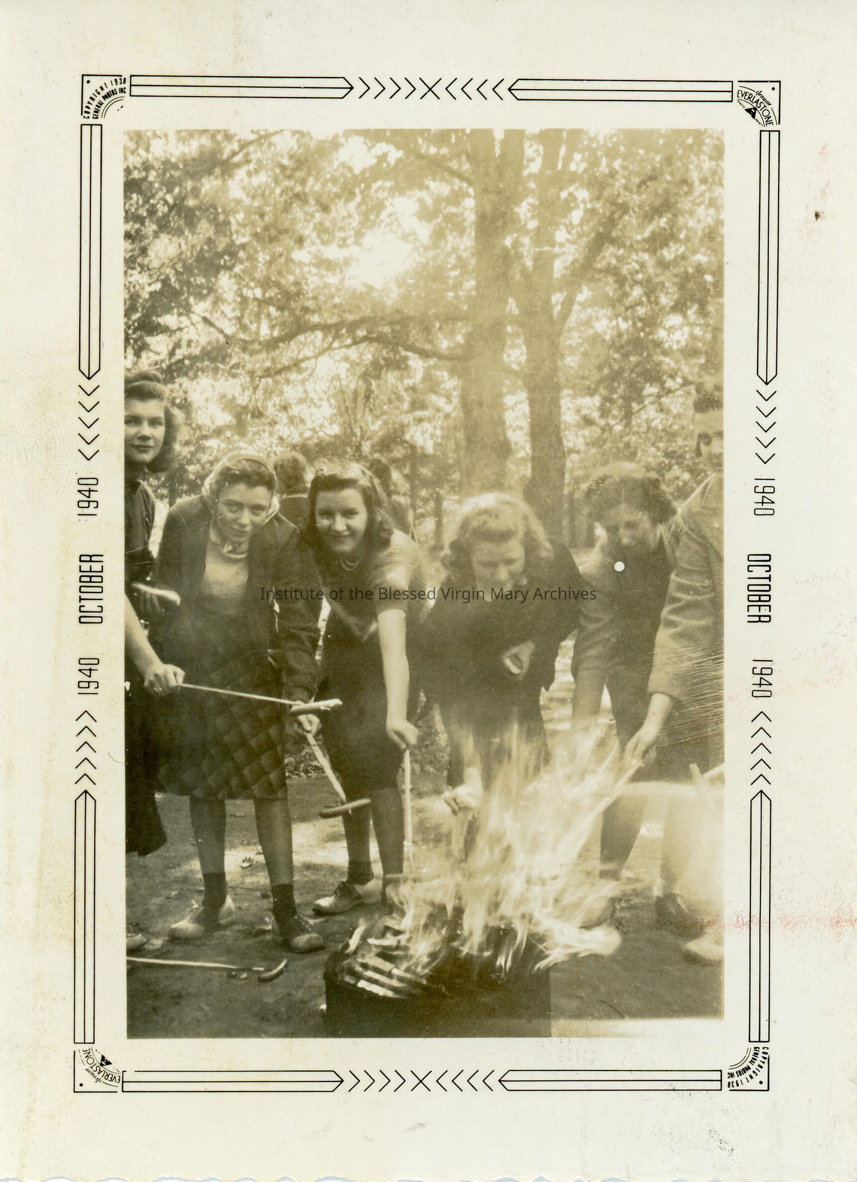 Loretto High School students roasting hot dogs at a senior picnic. The names Lois B. and Rita Cunningham appear on the back. The school was located in the 6500 block of Stewart Avenue in Englewood, Chicago.
