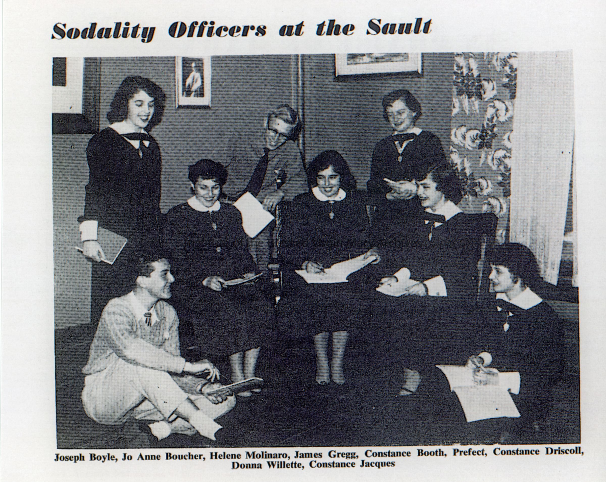 Members of the Loretto High School, formerly Loretto Academy, Sodality Club in Sault Ste. Marie, Michigan. From left to right are Joseph Boyle, Jo Anne Boucher, Helene Molinaro, James Gregg, Constance Booth, Constance Driscoll, Donna Willette and Constance Jacques.