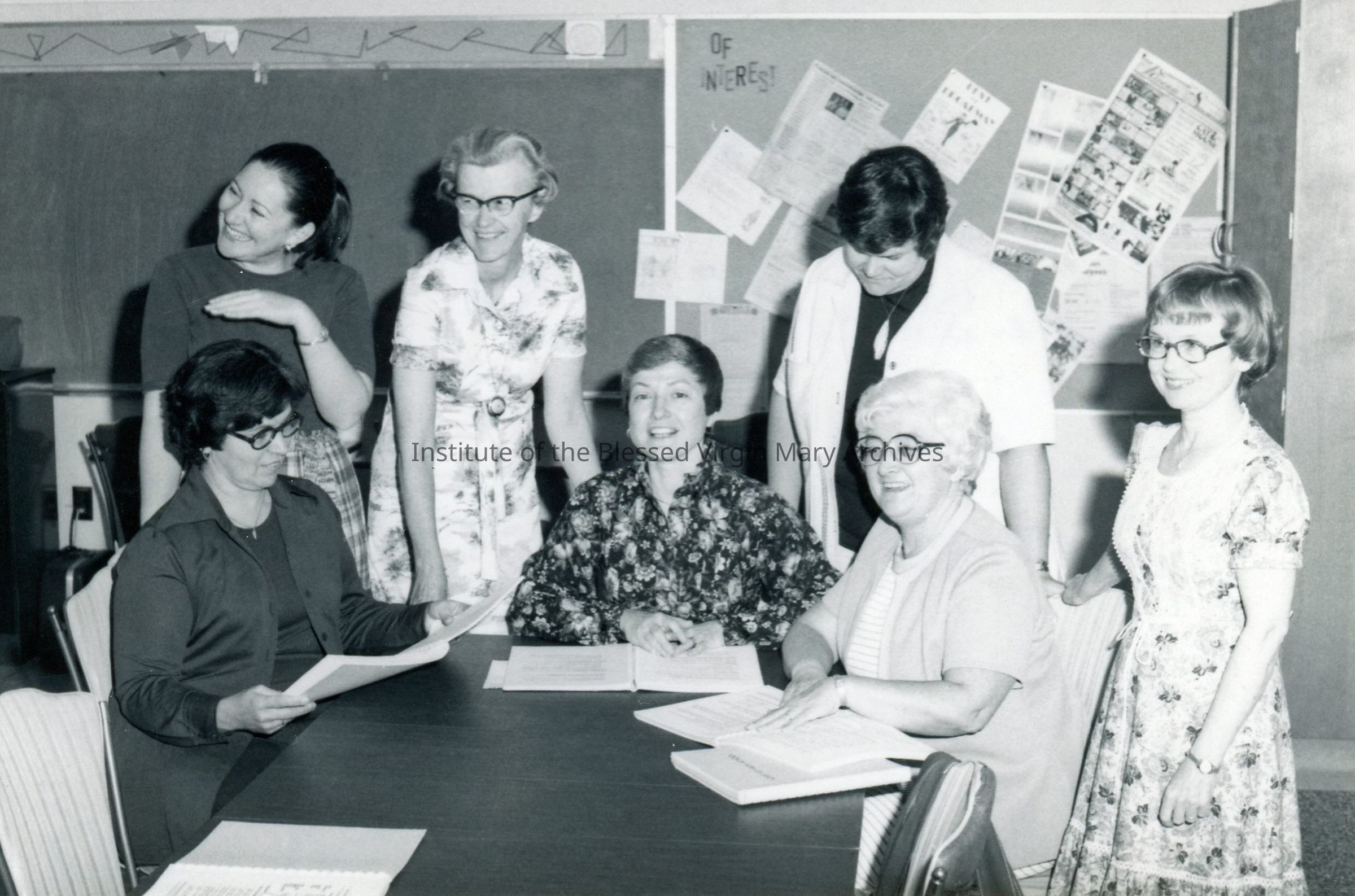 Staff at Loretto High School in Sacramento, California. From left to right are Arlene Fraser, Mary Daughtery, Sister Mary (Collette) Srill, Sister Frances (Maria Regina) Bierer, Sister Jean Frye, Sister Nora (St. Catharine) Lowe and Sister Rita (Francis de Sales) Clarke.
