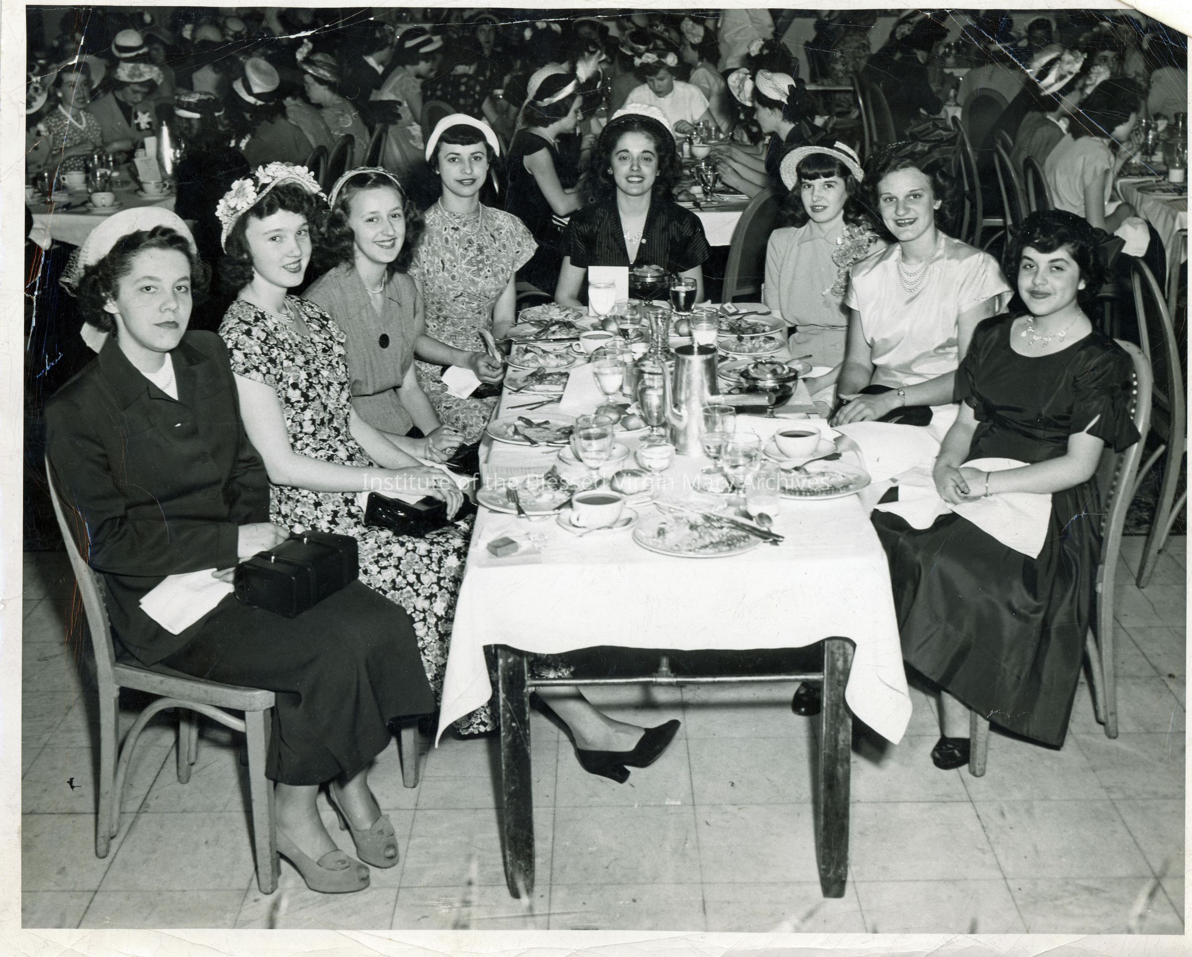 Loretto High School students attending an event in the Shoreland Hotel at 5454 South Shore Drive. The name Joan Byrne appears on the back. The school was located in the 6500 block of Stewart Avenue in Englewood, Chicago.
