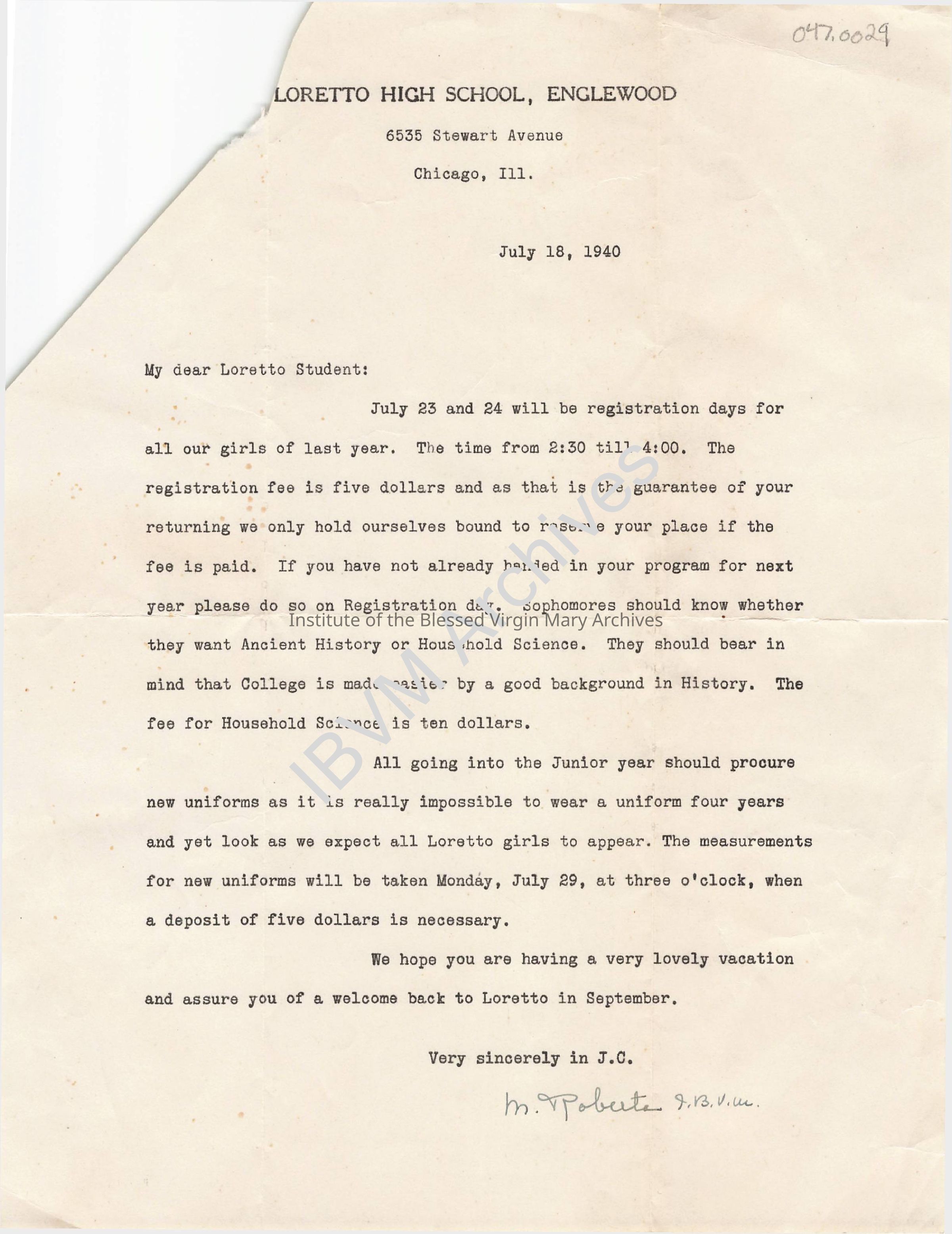 Letter sent to returning students of Loretto High School at 6535 Stewart Avenue in Englewood, Chicago. It discusses registration day, fees, classes, uniforms and more.