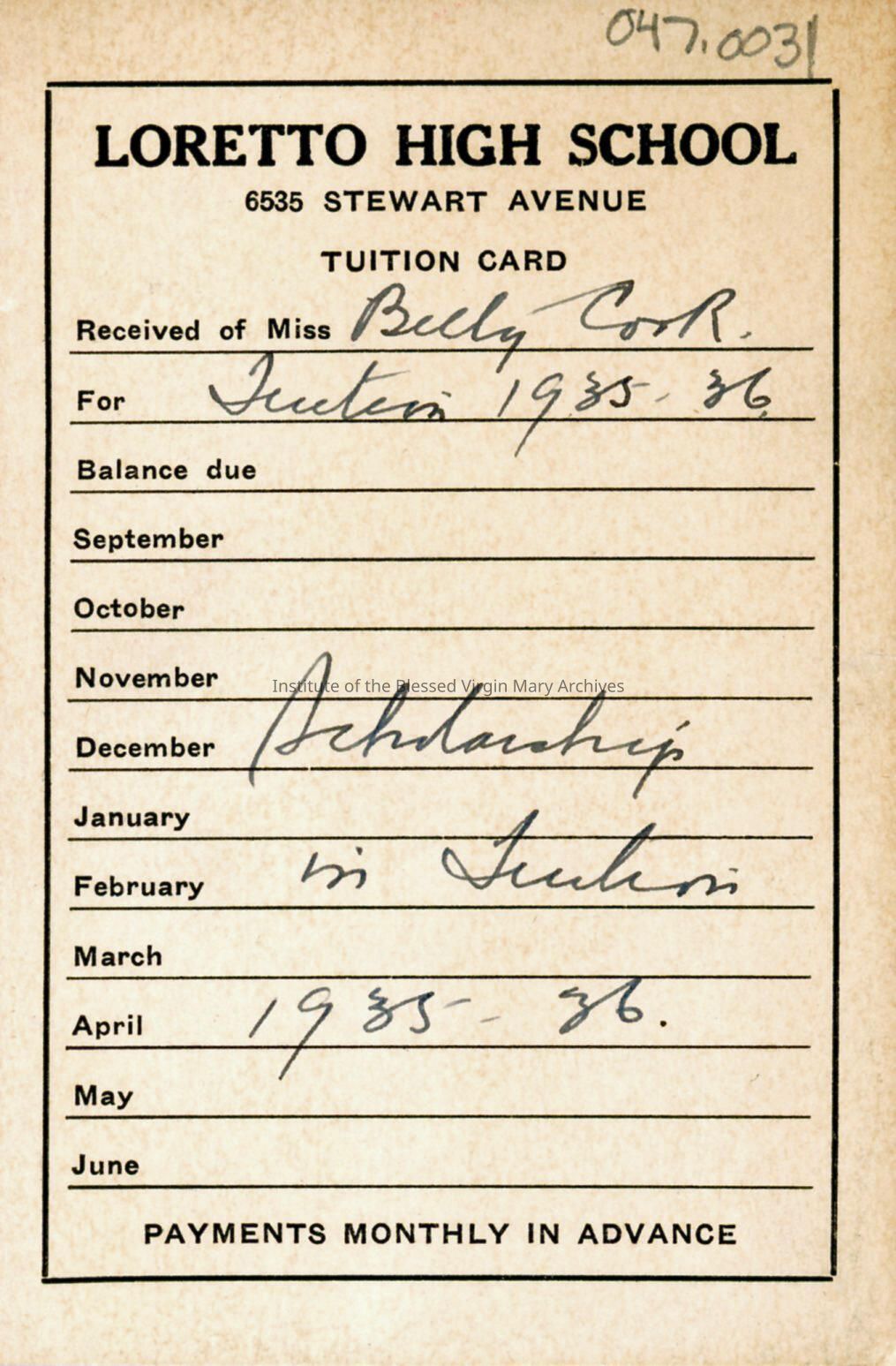 Loretto High School tuition card for Betty Cook. The school was located at 6535 Stewart Avenue in Englewood, Chicago.