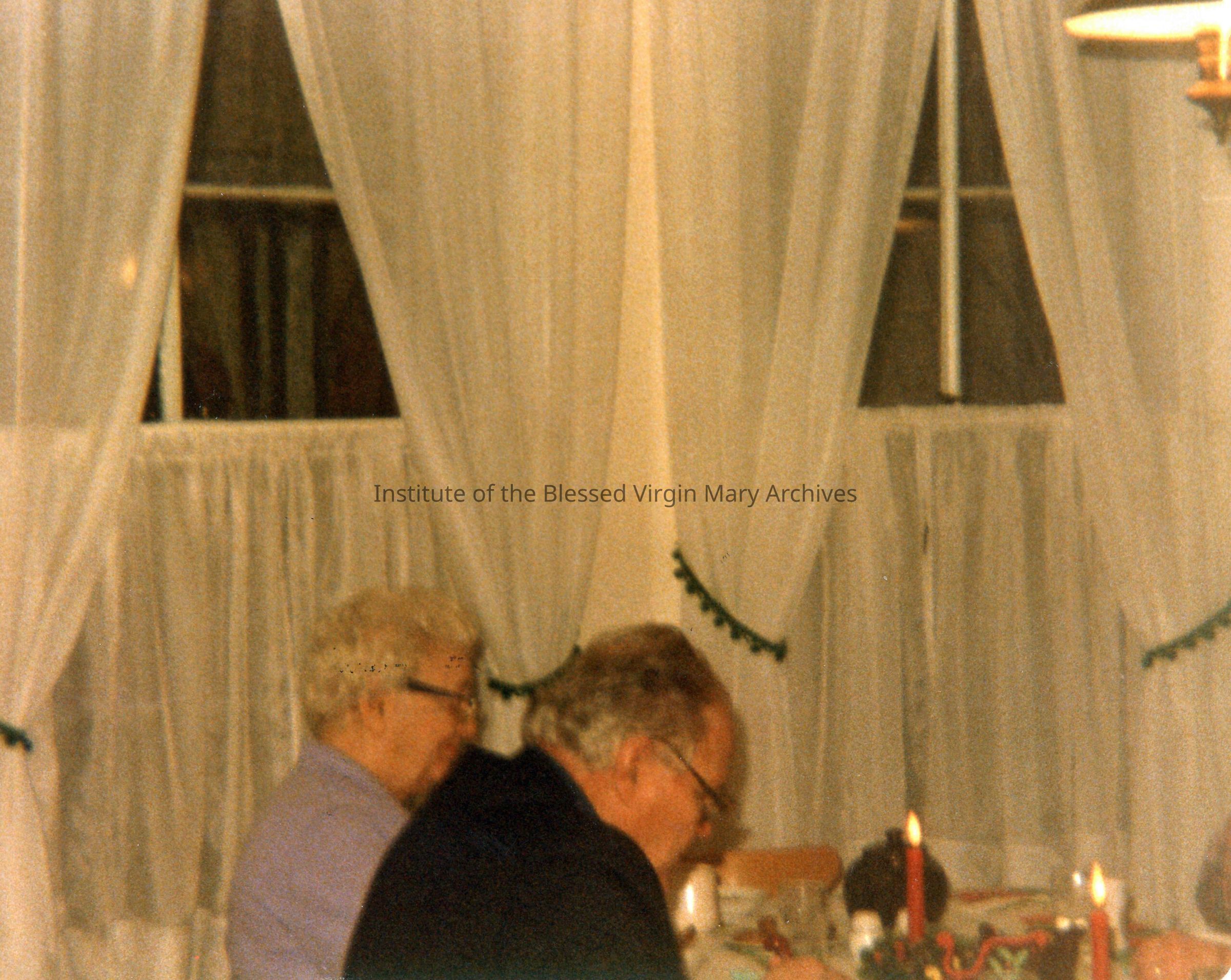 IBVM residence located at 414 Dawson Street in Sault Ste. Marie, Michigan. This image features Father Joe and Ellen Trumbley at Christmas Eve dinner. The Sisters moved to this home after the IBVM Convent, located at 377 Maple Street, closed in late 1984.