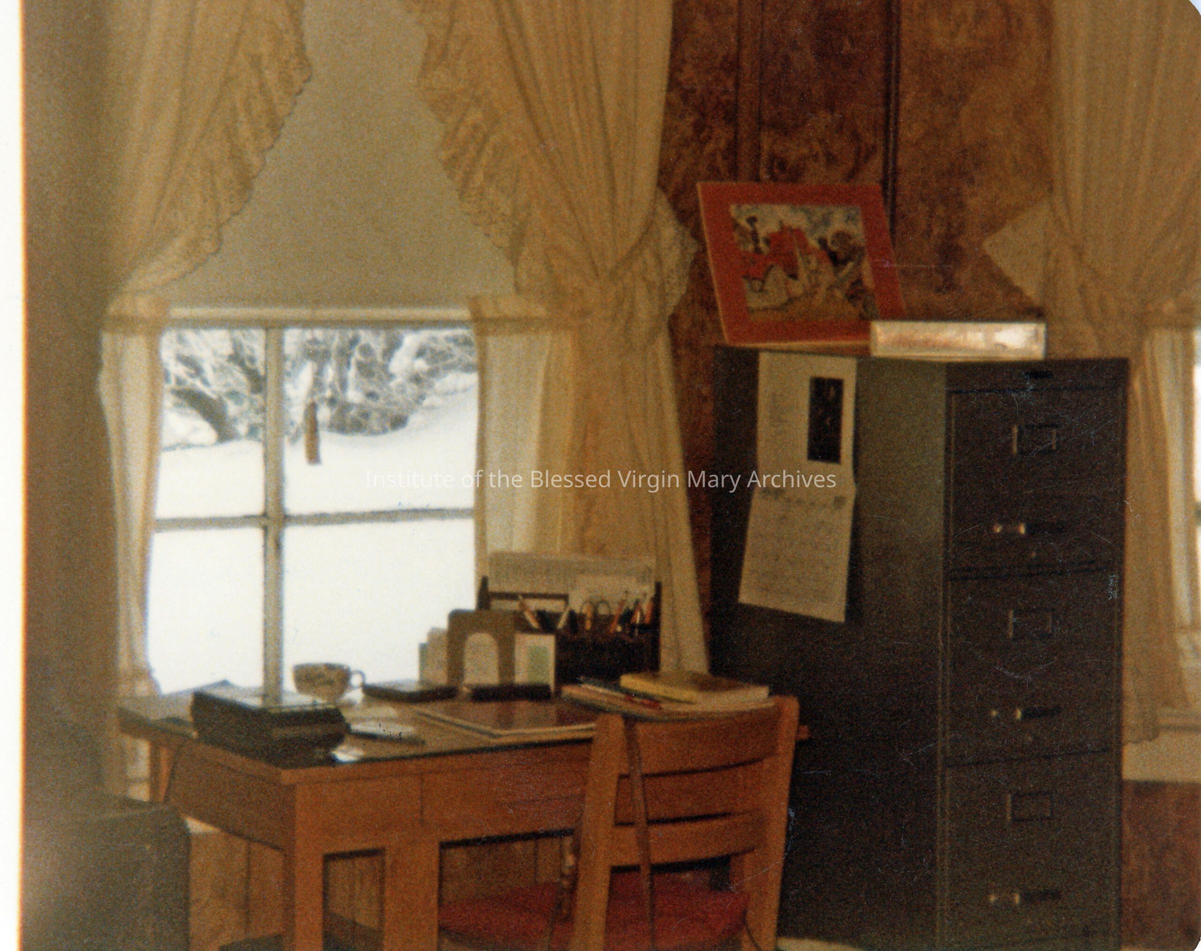 IBVM residence located at 414 Dawson Street in Sault Ste. Marie, Michigan. This image features the bedroom and office of Sister Mary Ann (Mark) White. The Sisters moved to this home after the IBVM Convent, located at 377 Maple Street, closed in late 1984.