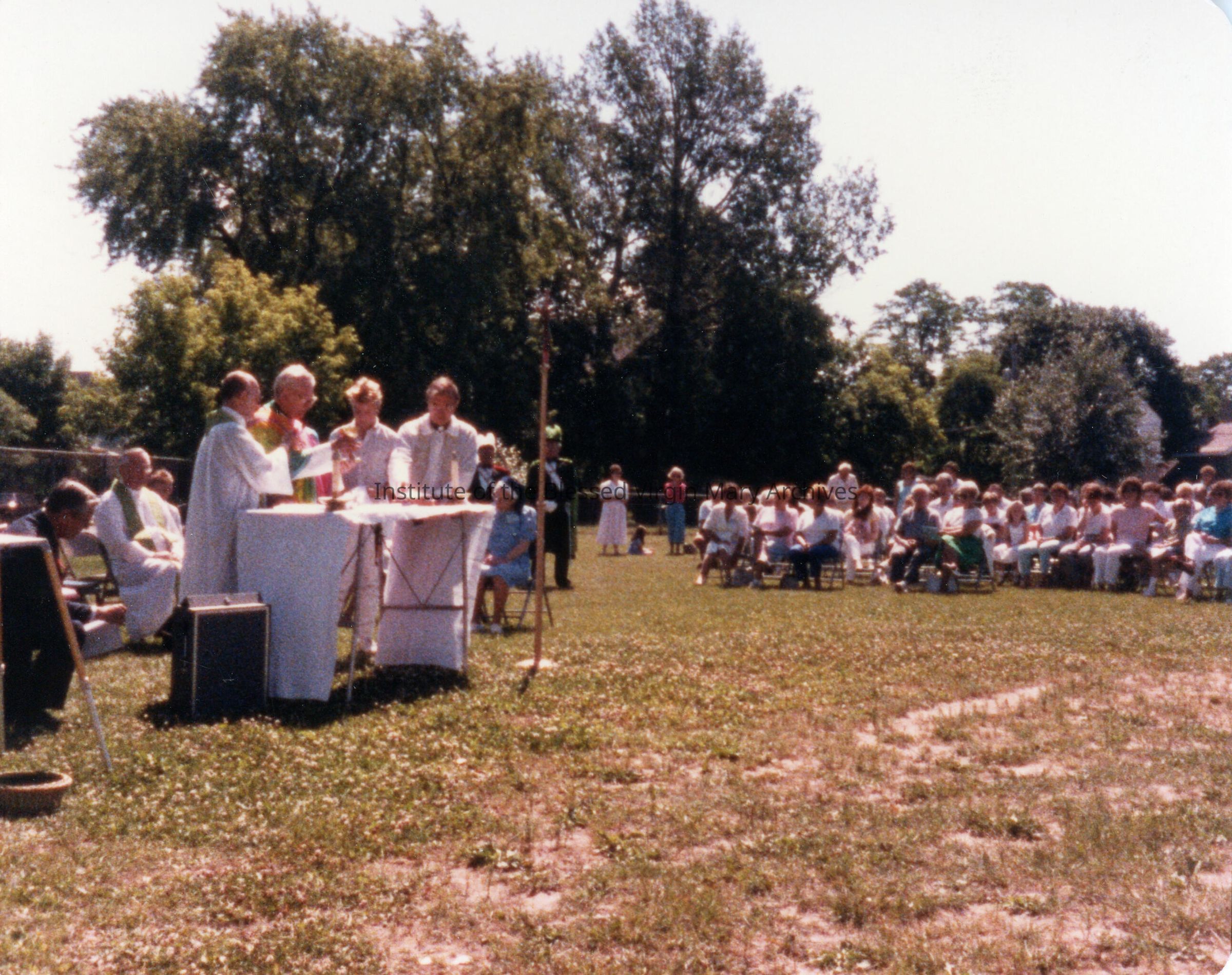 Loretto Park dedication ceremony in Sault Ste. Marie, Michigan. The event was held on the former site of Loretto Academy. Founded in 1896, the academy's location at 377 Armory Place (pictured) opened in 1899 and underwent a substantial addition in 1910. Converted into a co-ed high school in 1944, it was demolished in 1966 after Loretto Catholic Central High School was constructed.