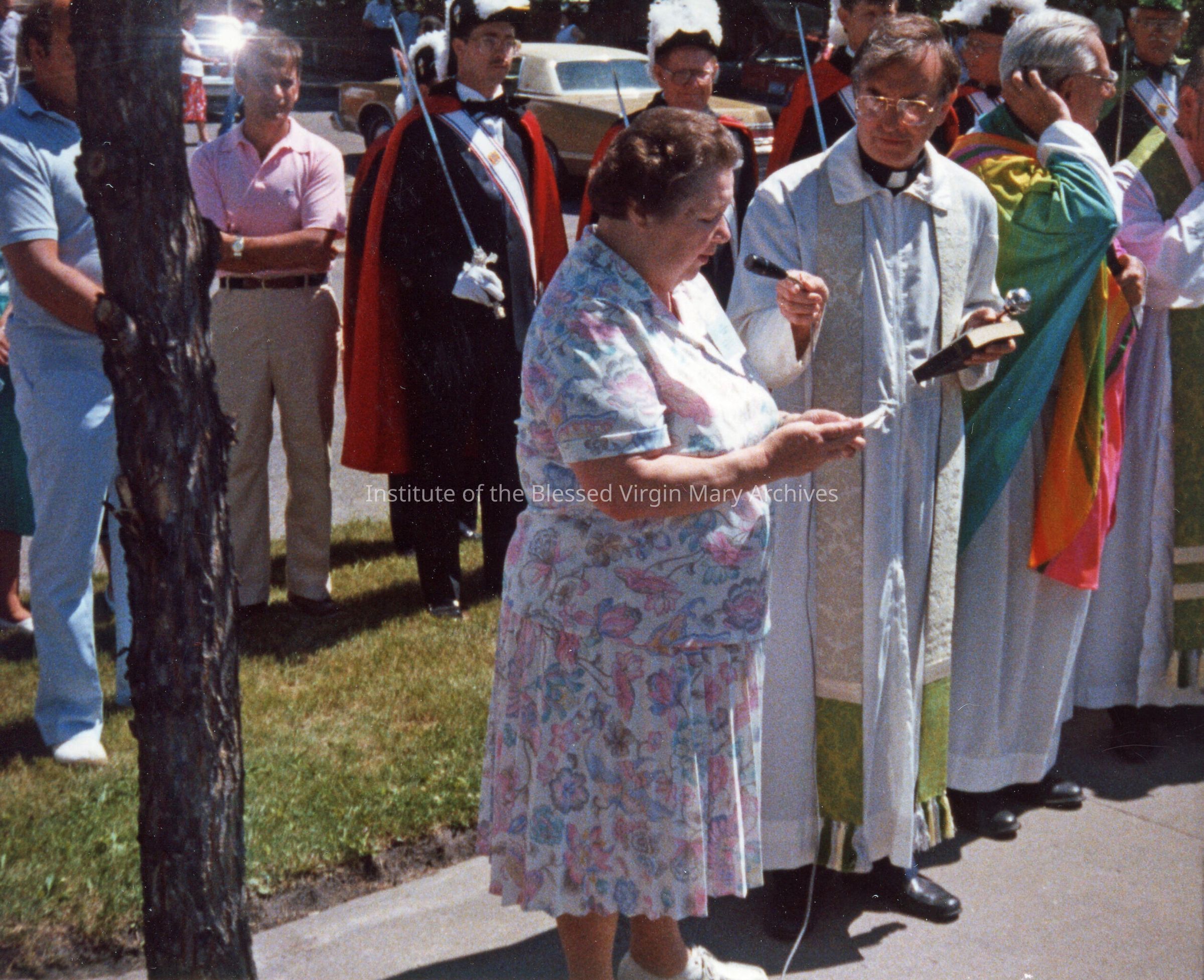 Loretto Park dedication ceremony in Sault Ste. Marie, Michigan. Sister Mary (Corona) Quinn is speaking and members of the Knights of Columbus are present. The event was held on the former site of Loretto Academy. Founded in 1896, the academy's location at 377 Armory Place (pictured) opened in 1899 and underwent a substantial addition in 1910. Converted into a co-ed high school in 1944, it was demolished in 1966 after Loretto Catholic Central High School was constructed.