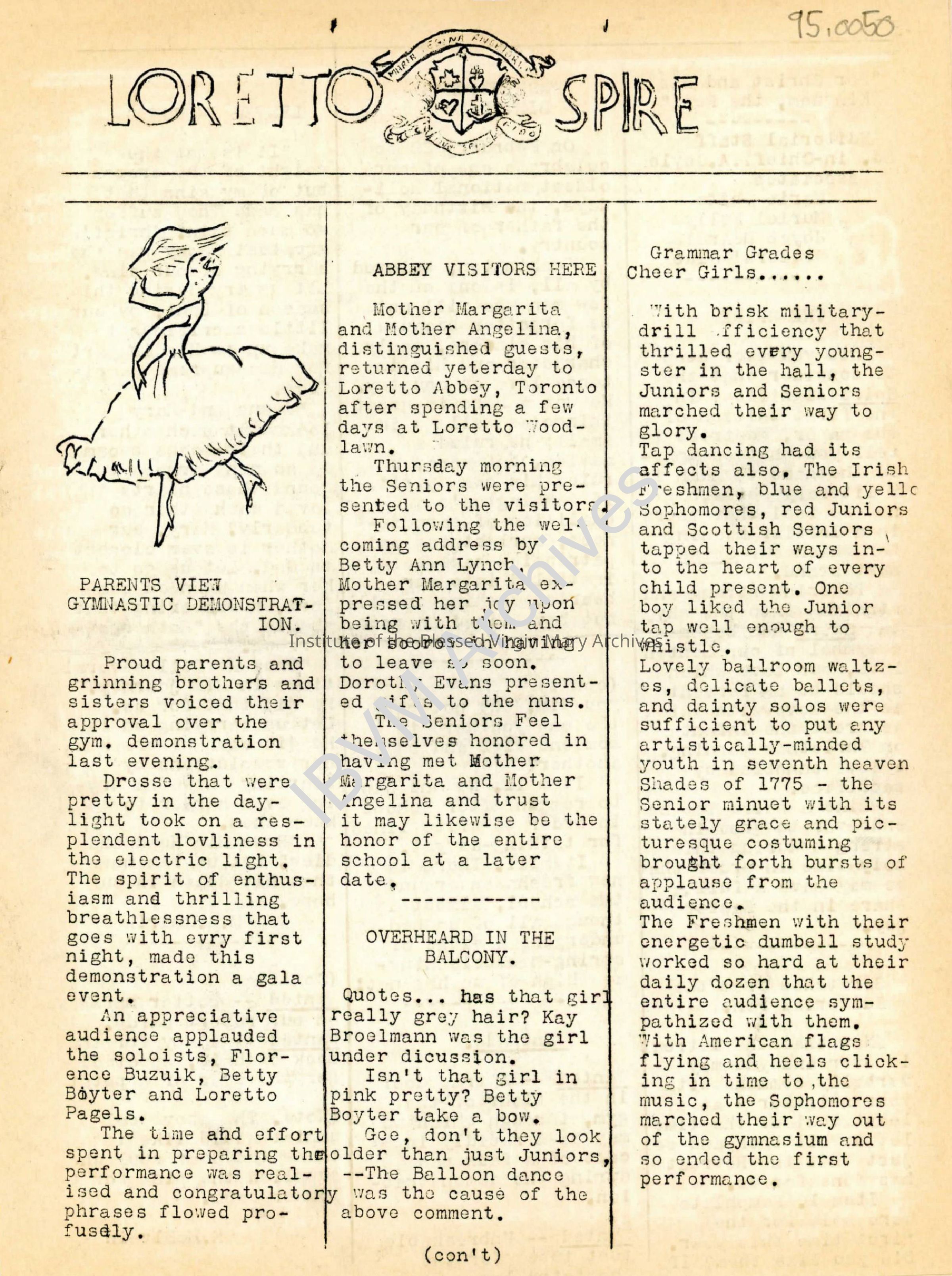 Issue of the Loretto Spire newsletter published by students of Loretto Academy Woodlawn. It includes a list of staff, articles, editorials, drawings and more. In addition George Washington, Lent and a gymnastic demonstration are discussed.