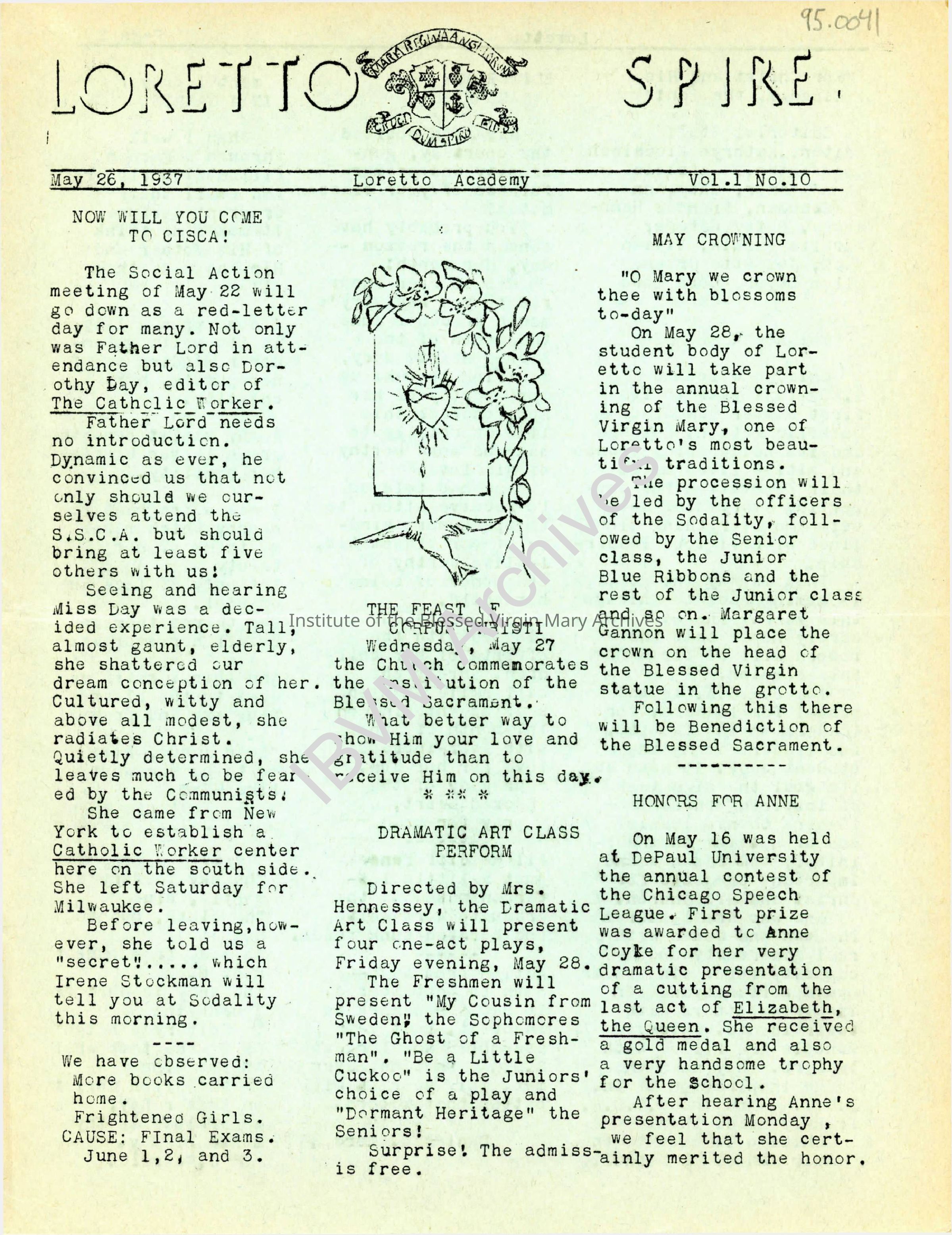 Issue of the Loretto Spire newsletter published by students of Loretto Academy Woodlawn. It includes a list of staff, articles, editorials, drawings and more. In addition, Dorothy Day, editor of the Catholic Worker, and Adolph Hitler are discussed.