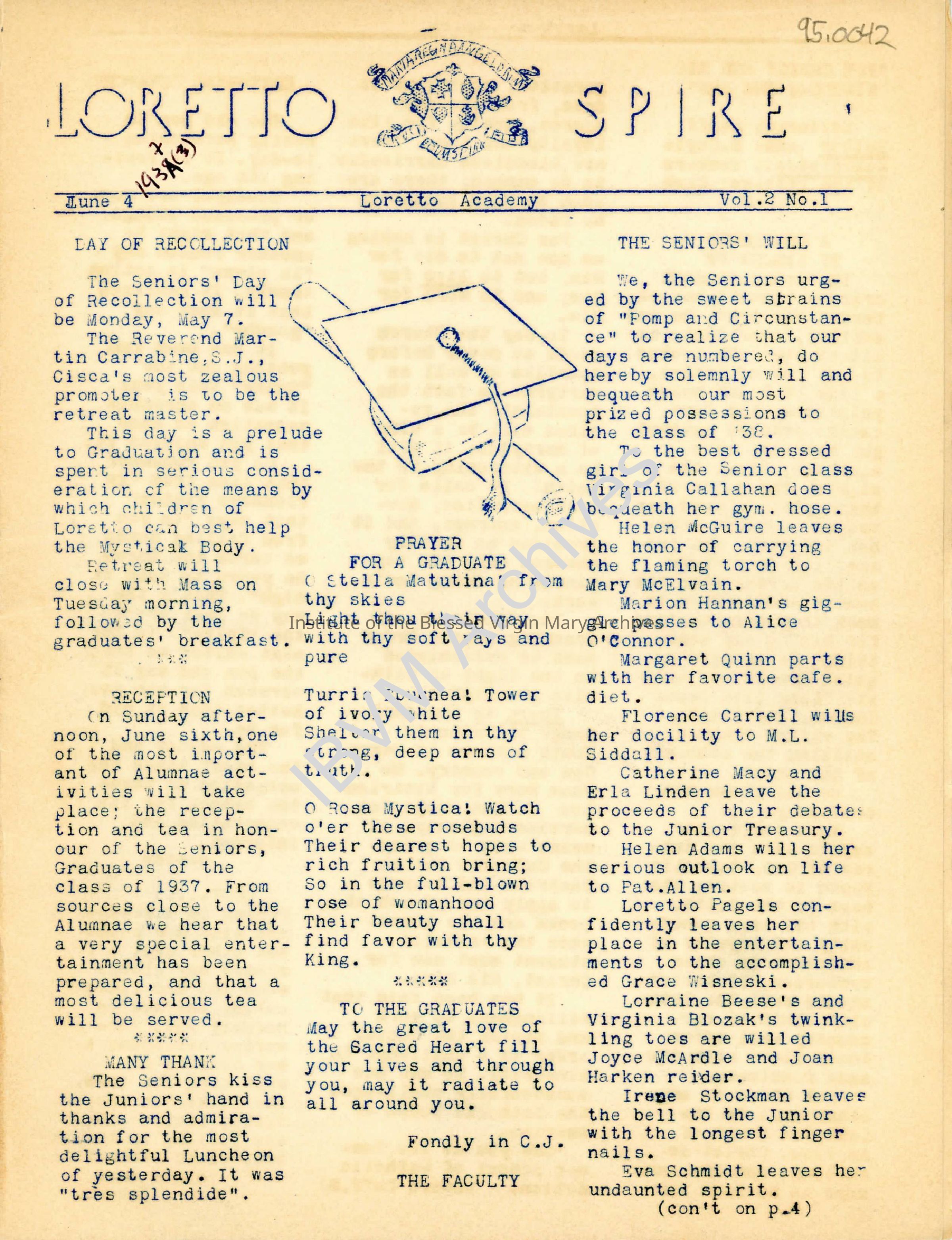 Issue of the Loretto Spire newsletter published by students of Loretto Academy Woodlawn. It includes a list of staff, articles, editorials, drawings and more. The back page features signatures of the Class of 1937.