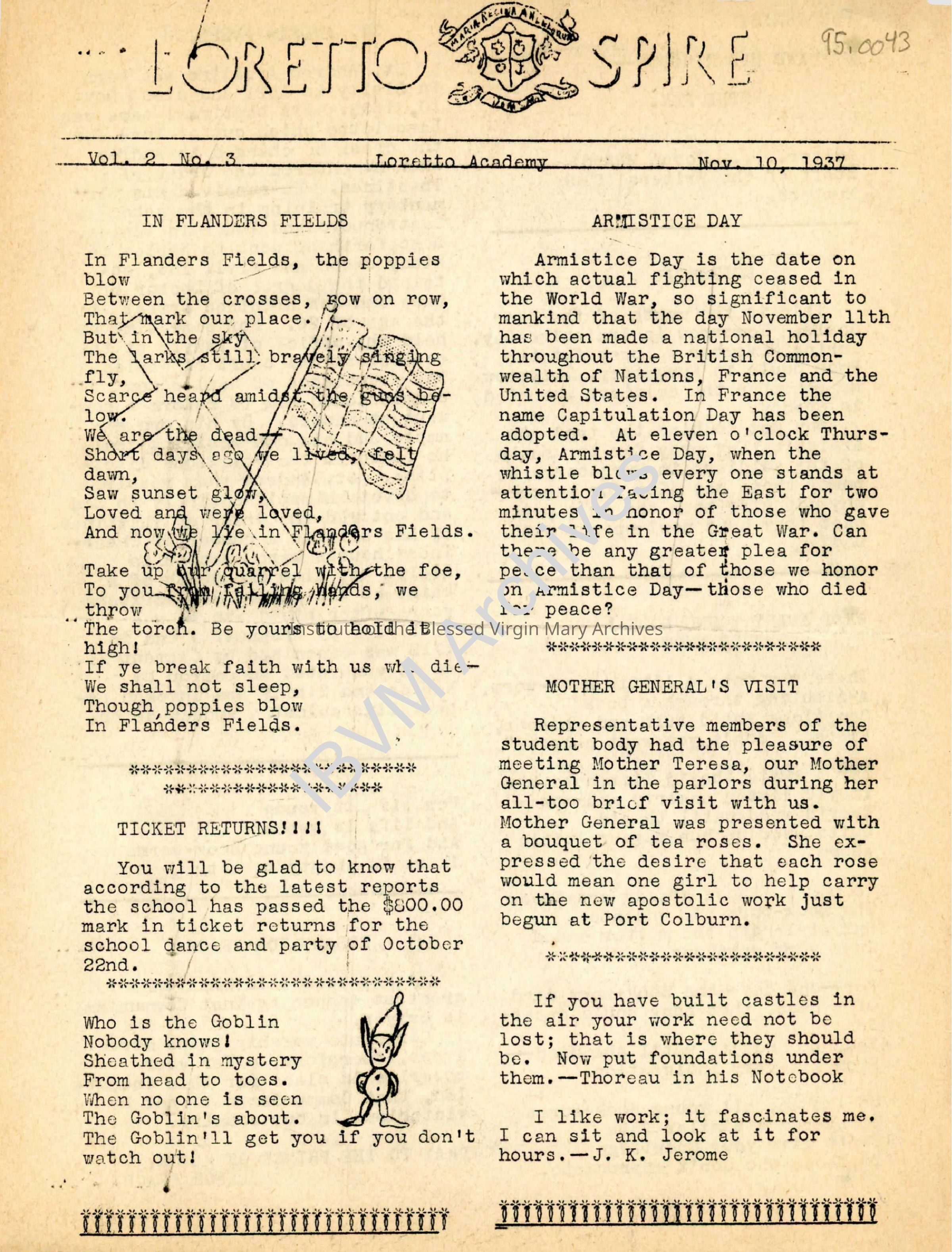 Issue of the Loretto Spire newsletter published by students of Loretto Academy Woodlawn. It includes a list of staff, articles, editorials, drawings and more. In addition, Armistice Day and St. Andrew Avellino are discussed.