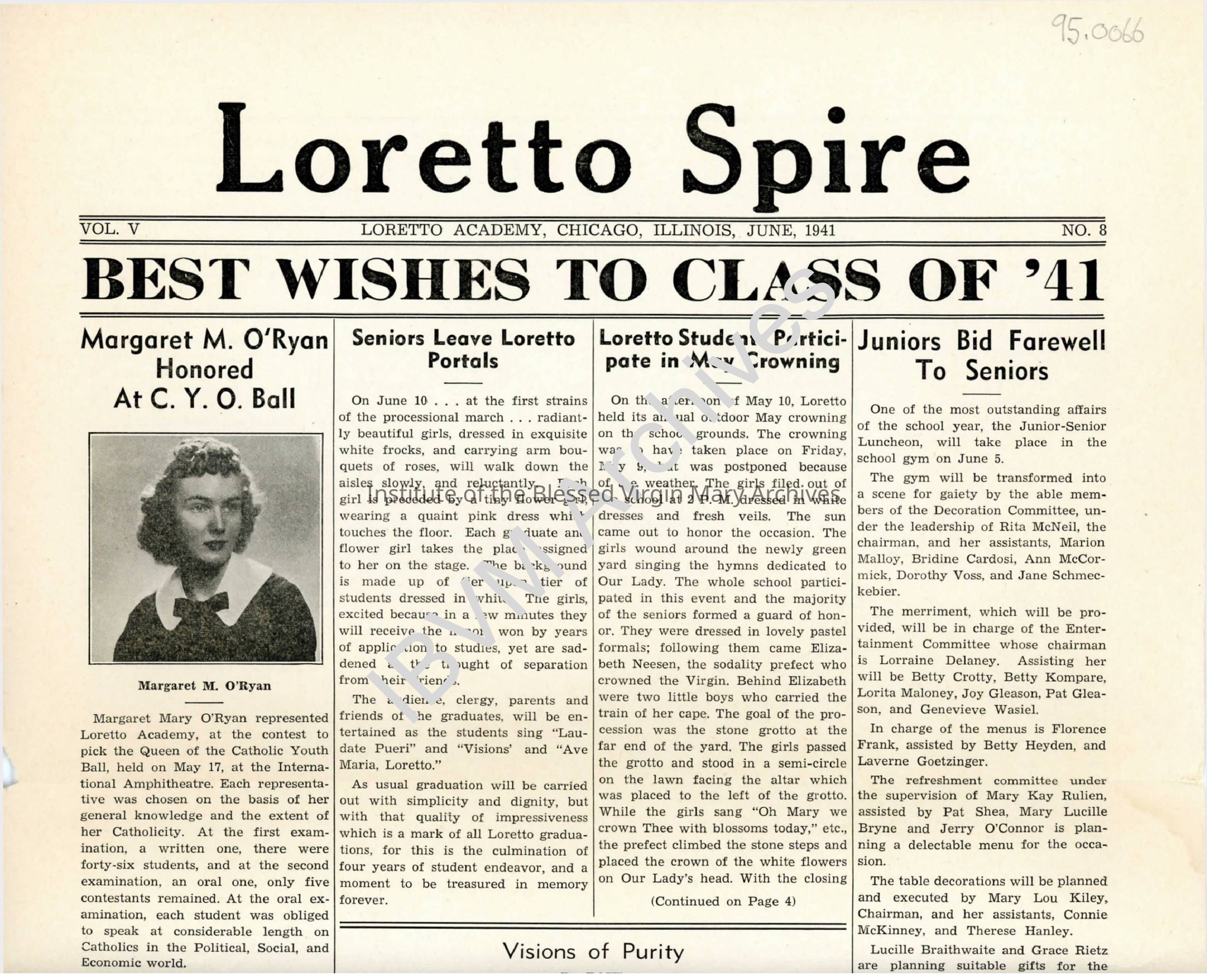 Issue of the Loretto Spire newsletter published by students of Loretto Academy Woodlawn. It includes a list of staff, articles, editorials, drawings and photos of Margaret M. O'Ryan and Mary Anita Gerber. In addition May Crowning, senior prom and a piano recital are discussed.