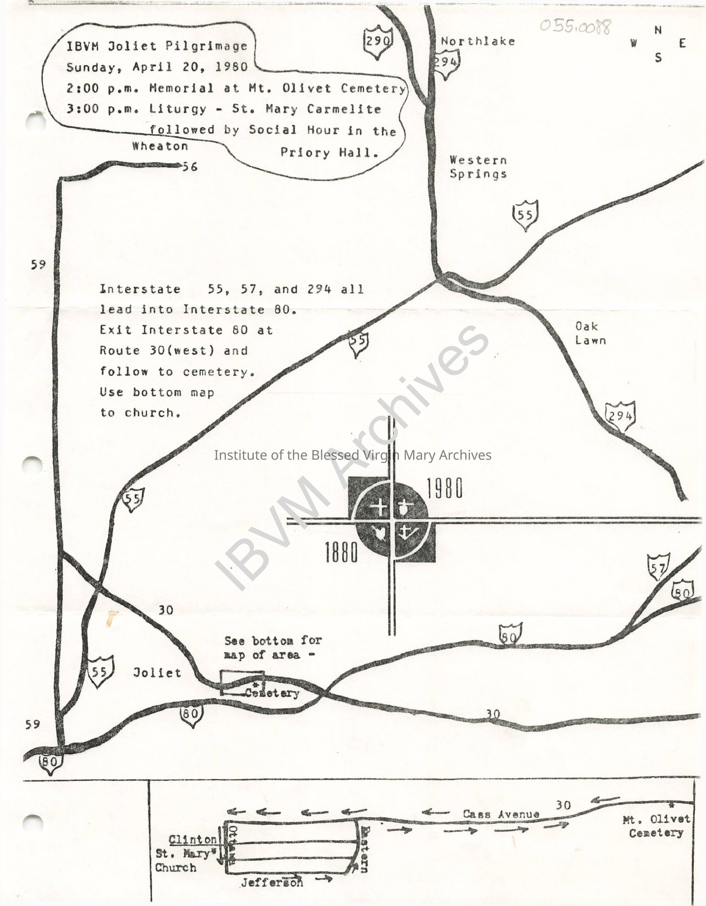 Map produced for the IBVM Pilgrimage to Joliet. Locations include Mount Olivet Cemetery, St. Mary's Carmelite Church, Northlake, Western Springs, Oak Lawn, Wheaton and various Interstate Highways.