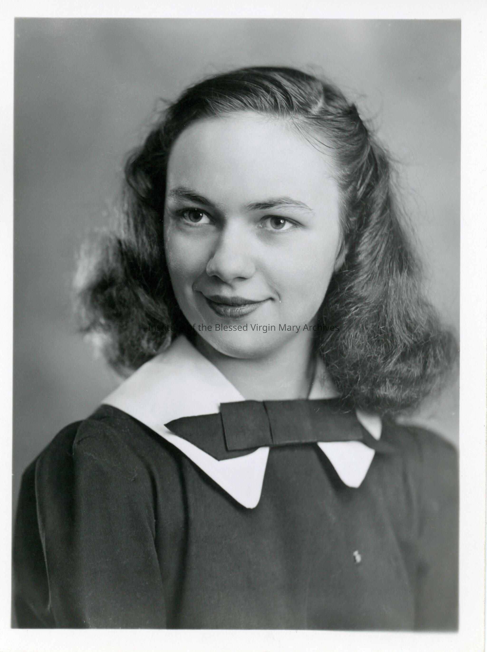 Portrait of Mary Giacoletto, a 1946 graduate of Loretto High School, formerly Loretto Academy, in Sault Ste. Marie. Founded in 1896, the academy's location at 377 Armory Place opened in 1899 and underwent a substantial addition in 1910. Converted into a co-ed high school in 1944, it was demolished in 1966 after Loretto Catholic Central High School was constructed.