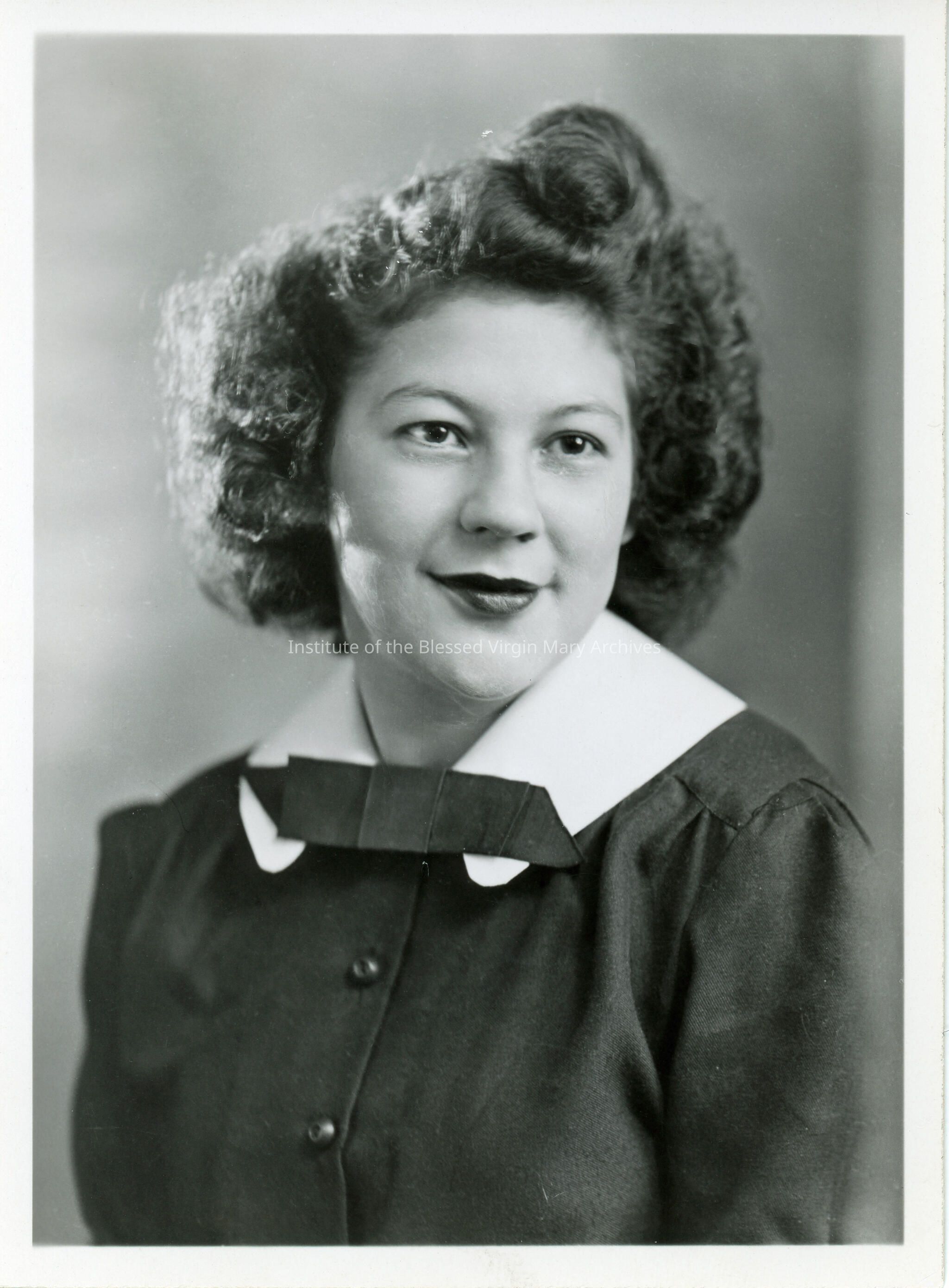 Portrait of Mary Massey, a 1946 graduate of Loretto High School, formerly Loretto Academy, in Sault Ste. Marie. Founded in 1896, the academy's location at 377 Armory Place opened in 1899 and underwent a substantial addition in 1910. Converted into a co-ed high school in 1944, it was demolished in 1966 after Loretto Catholic Central High School was constructed.
