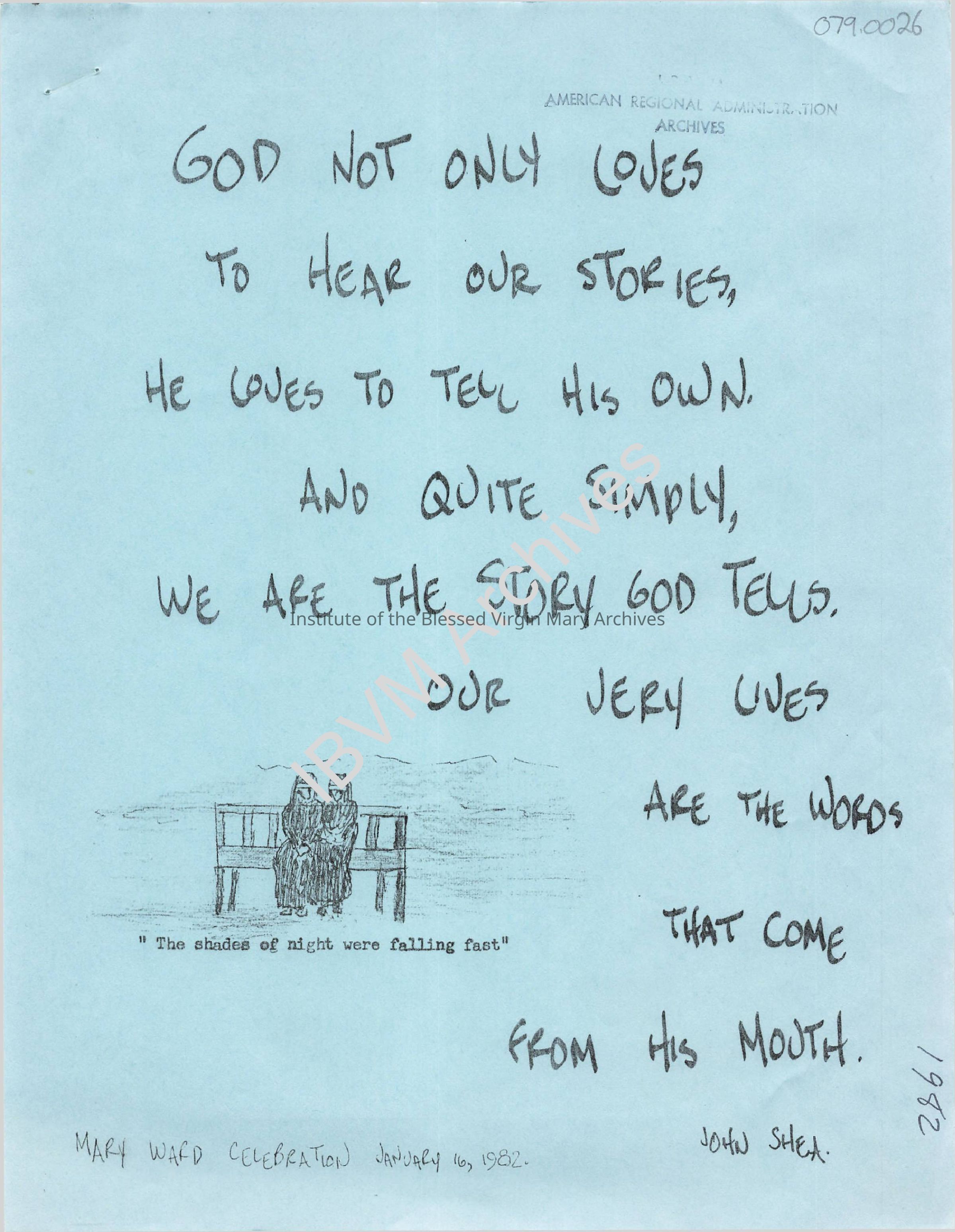 Compiled in celebration of Mary Ward, this booklet contains a number of stories, poetry and anecdotes detailing the history of the IBVM in the United States. Topics include Sault Ste. Marie, Englewood, Woodlawn, Vatican II, Joliet, Loretto Kindergarten, South Dakota, Northlake, and more. A number of IBVM Sisters are mentioned and the booklet features a preface by Sister Nancy Lee (del Ray) Waite.