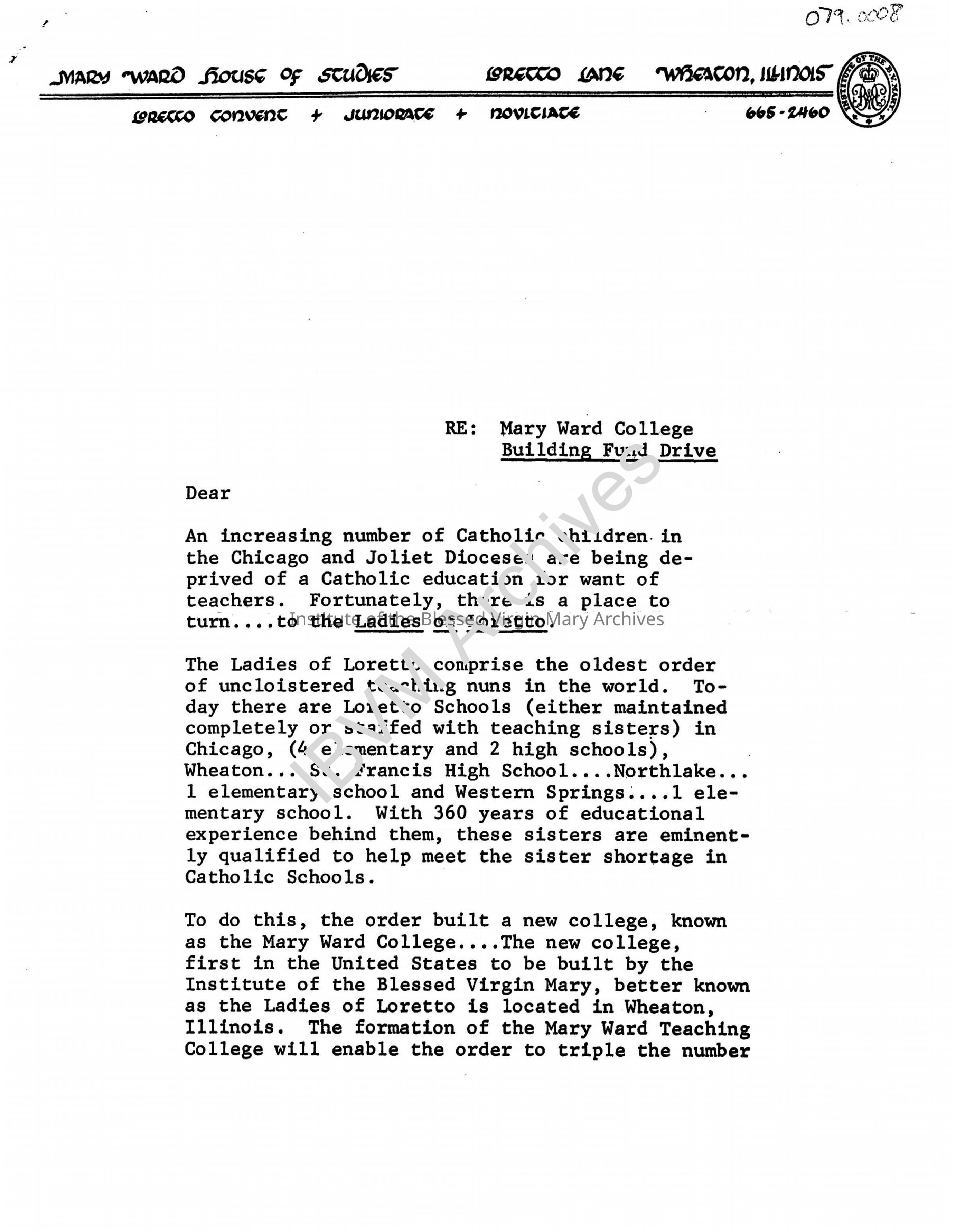 Fundraising letter for the Mary Ward House of Studies and Mary Ward Teaching College. Completed in 1964, the building was located adjacent to the Loretto Convent and Chapel in Wheaton.