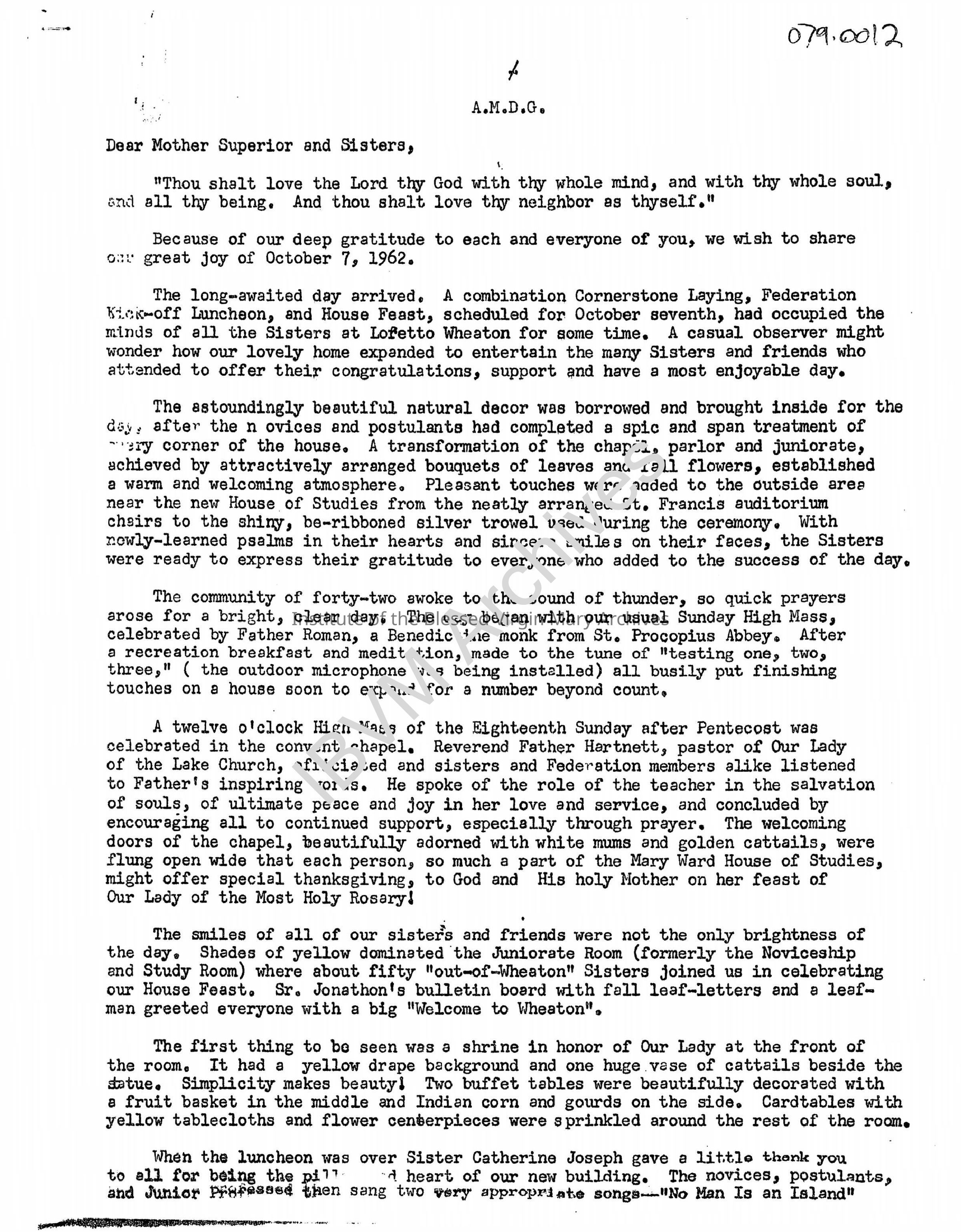 Letter regarding the cornerstone blessing ceremony for the Mary Ward House of Studies. It discusses the day's events, weather, attendees, decorations, the Loretto Federation, music and more. Completed in 1964, the building was located adjacent to the Loretto Convent and Chapel in Wheaton.