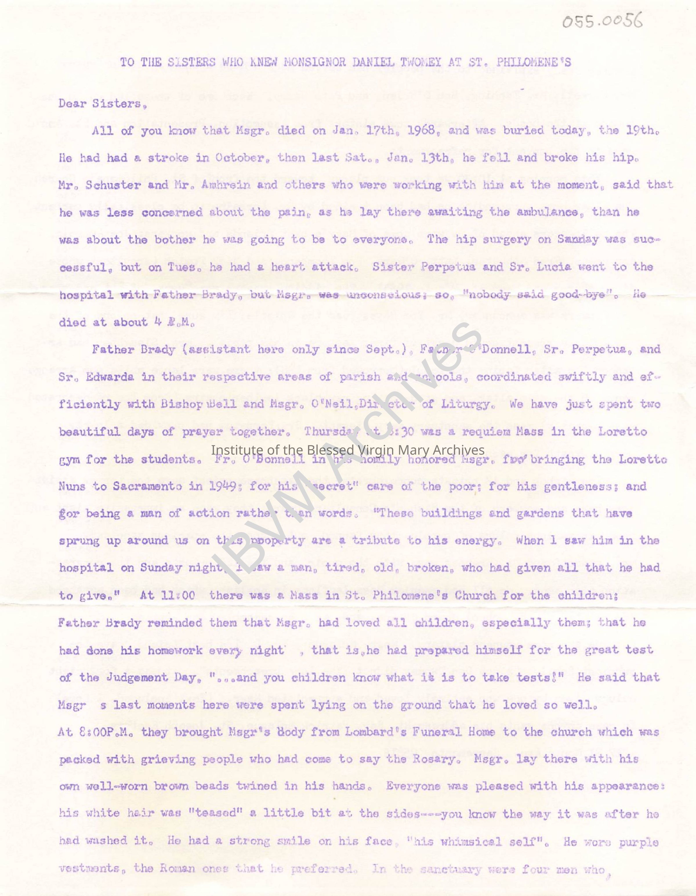Letter from Sister Florence (St. Camillus) Hayes discussing the passing of Monsignor Daniel Twomey of St. Philomene in Sacramento, California. It briefly discusses his life, the role he played in bringing the Loretto Sisters to Sacramento, memorial services held in his honor and more. There is also a copy of the funeral homily given by Monsignor Patrick McTague.