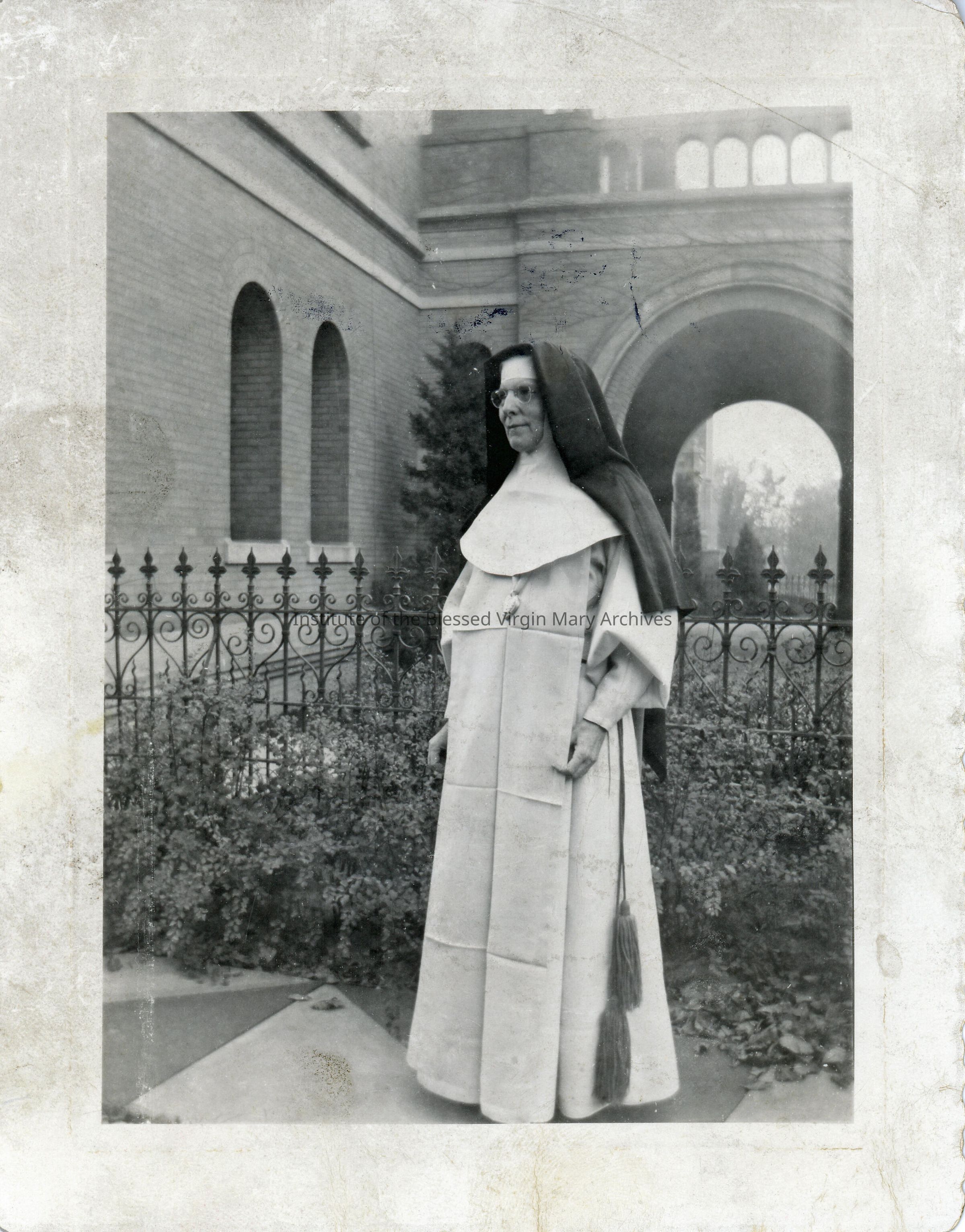 Mother Superior outside of the Good Shepard Convent at 653 South 40th Street in Omaha, Nebraska. The back of the image states that she was a 1906 graduate of Loretto Academy in Sault Ste. Marie, Michigan.
