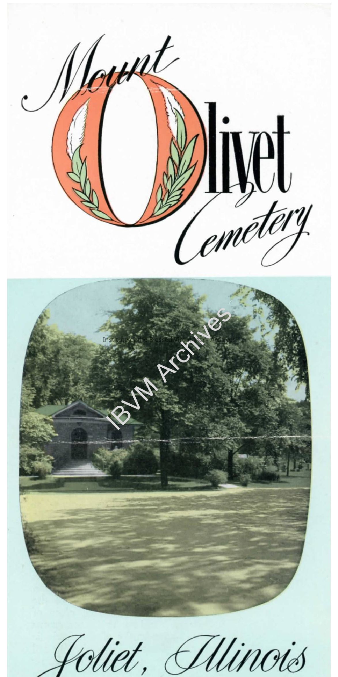Pamphlet for Mount Olivet Cemetery located in Joliet, Illinois. It contains general information about the cemetery along with handwritten notes regarding burial locations for Sisters of the Institute of the Blessed Virgin Mary. The cemetery was originally under the jurisdiction of St. Mary's Carmelite Church and the first burial took place in 1863.