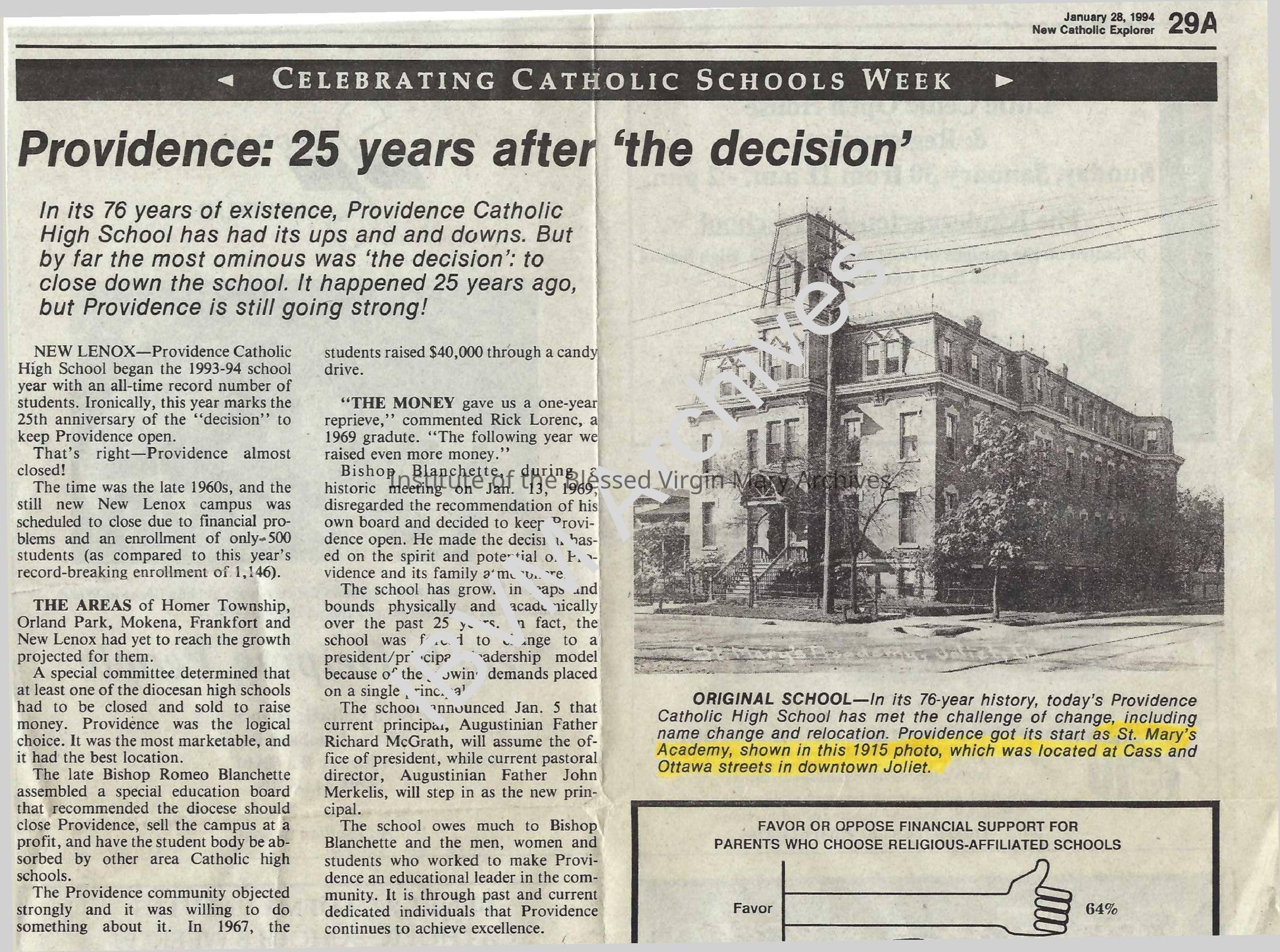 Article from the New Catholic Explorer newspaper discussing the history of Providence High School. It features an image of St. Mary's Academy in Joliet, Illinois as it appeared in 1915. Completed in 1883, the academy was located on the southwest corner of Ottawa Street and Cass Avenue.