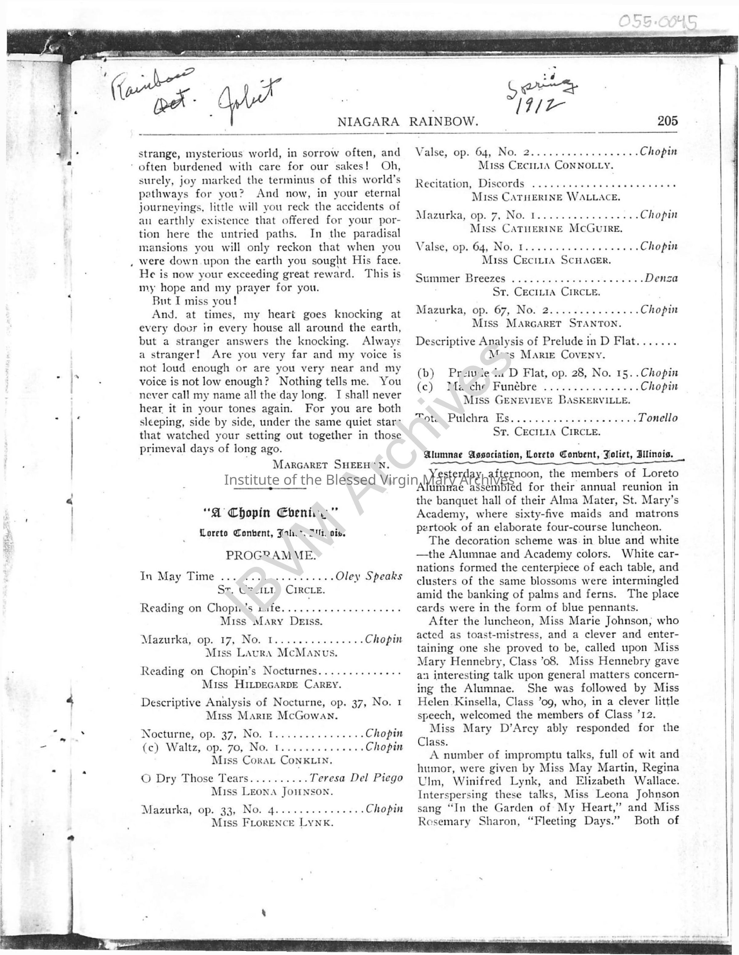Section of the Niagara Rainbow newsletter from Joliet, Illinois. It discusses topics such as a meeting of the Loretto Alumnae, a music recital featuring Julia O'Sullivan, international travel and more.