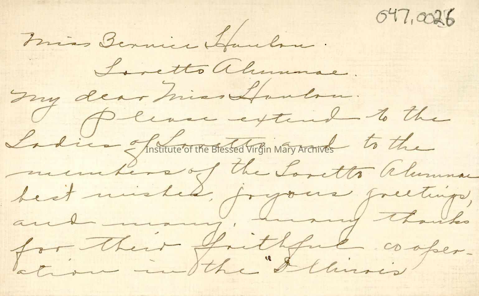 Handwritten note addressed to Loretto Alumnae from the International Federation of Catholic Alumnae. Loretto Alumnae from Englewood were members of the IFCA.