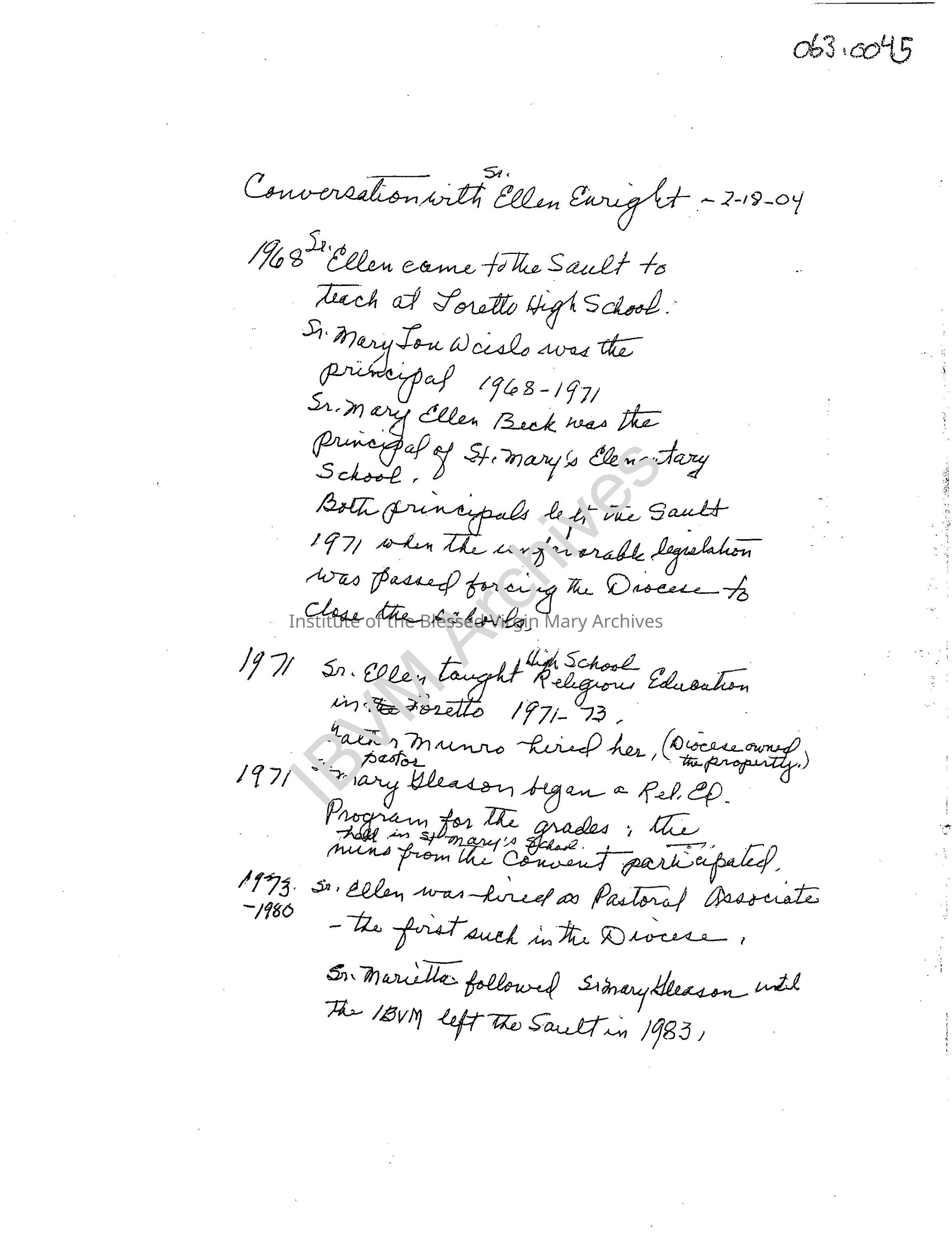 Handwritten notes taken during a conversation with Sister Ellen (Marie John) Enright. They detail her experiences in Sault Ste. Marie from 1968 - 1983. The names of Sister Mary Ellen (Roland) Beck, Sister Mary (Gabriel) Gleason, Sister Margaret (Marietta) Brummel and Sister Mary Lou (Paul) Wcislo also appear.