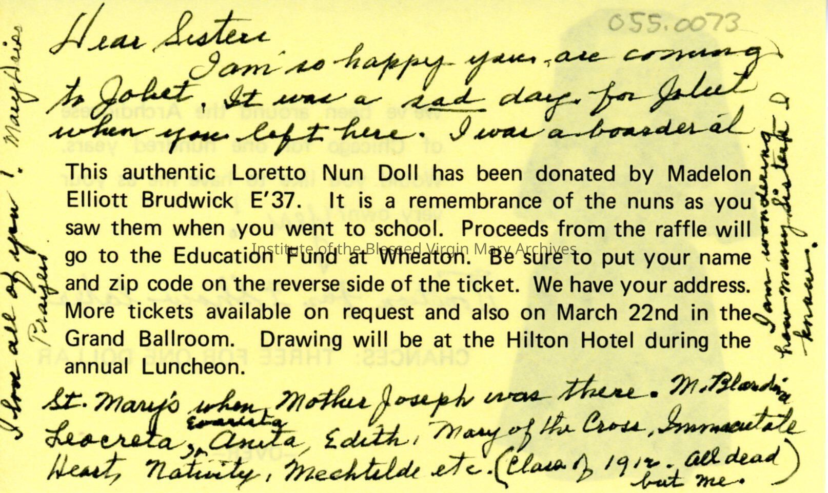 Notes from Mary Deiss and Frank Jeffers to Sister Miriam (Mary Clare) Mracek. They discuss personal history, the one hundredth anniversary of the IBVM in the United States and St. Bernard. The documents also promote an upcoming raffle, annual luncheon and fashion show.Context