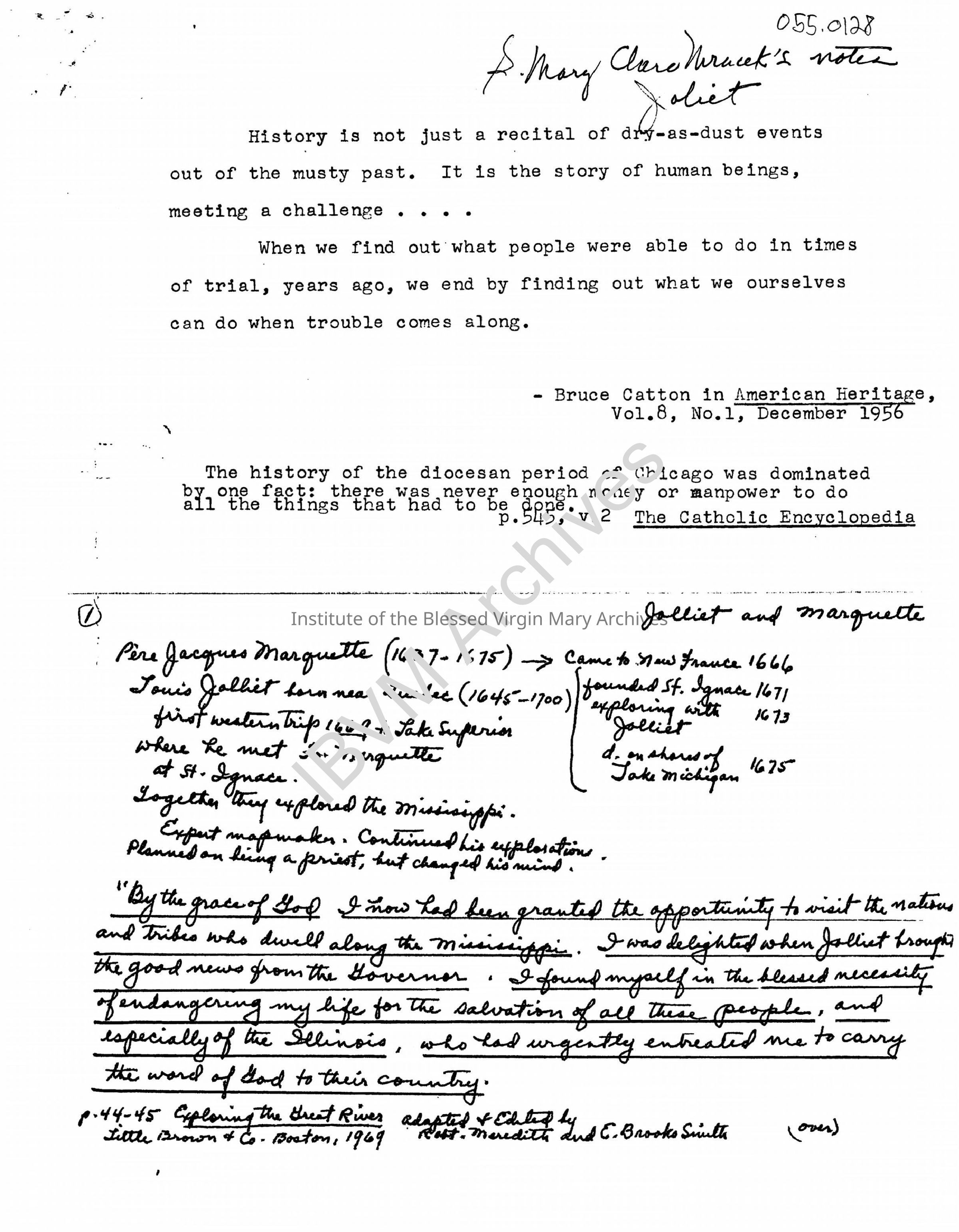 Handwritten research notes compiled by Sister Miriam (Mary Clark) Mracek. The first section focuses primarily on the history of Illinois and Chicago, and includes many topics such as Jacques Marquette, Louis Jolliet, Native Americans, Fort Dearborn, the Sanitary and Ship Canal, Chicago River and more. The second section highlights topics such as St Patrick's Parish, St. Mary's Parish, St. Mary's Academy, Sault Ste. Marie, Woodlawn, Englewood, St. Bride's and more.Context