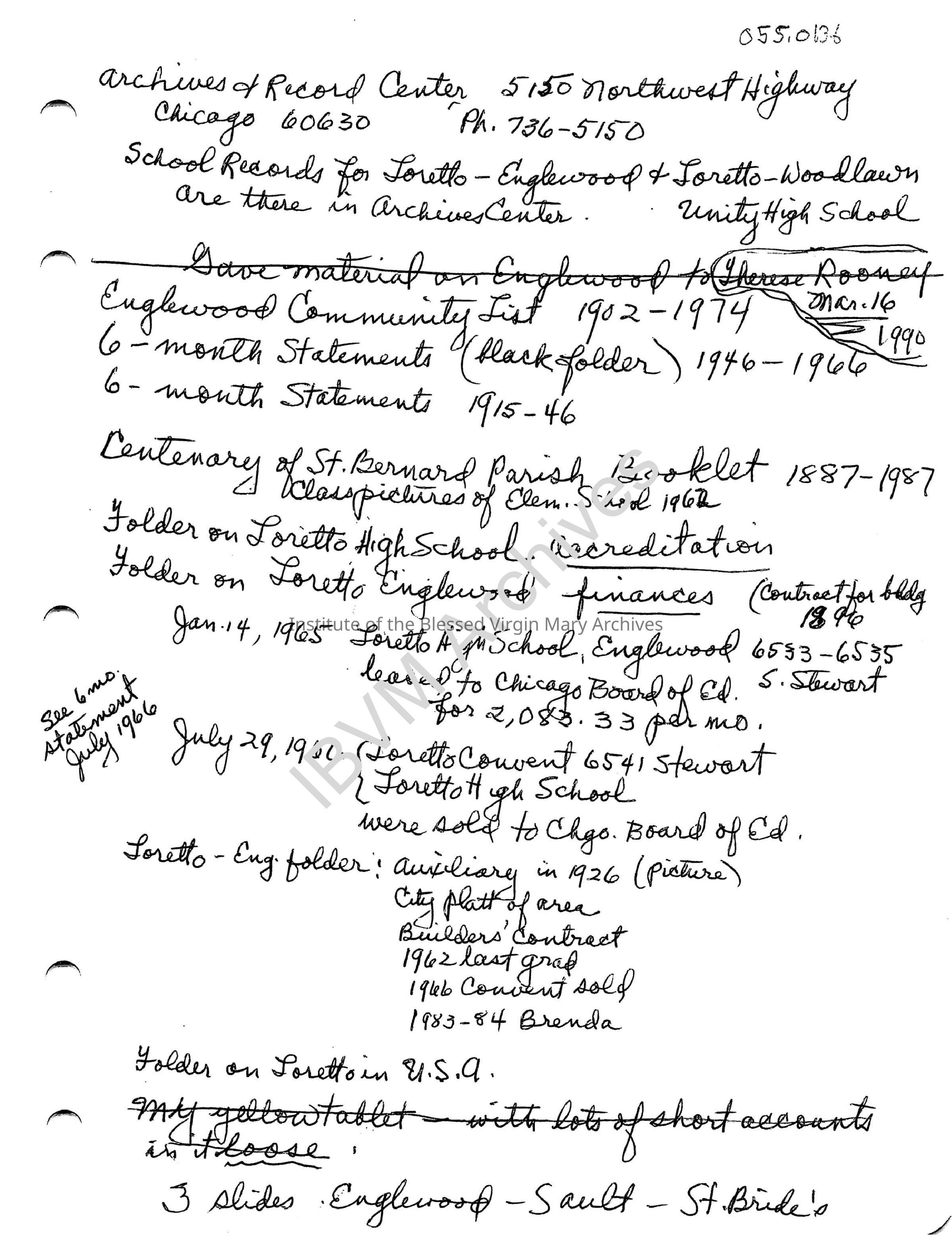Handwritten research notes believed to have been compiled by Sister Miriam (Mary Clare) Mracek. They focus on school records for Englewood and Woodlawn. Topics include St. Bernard's, Loretto High School, Loretto Englewood and more.Context