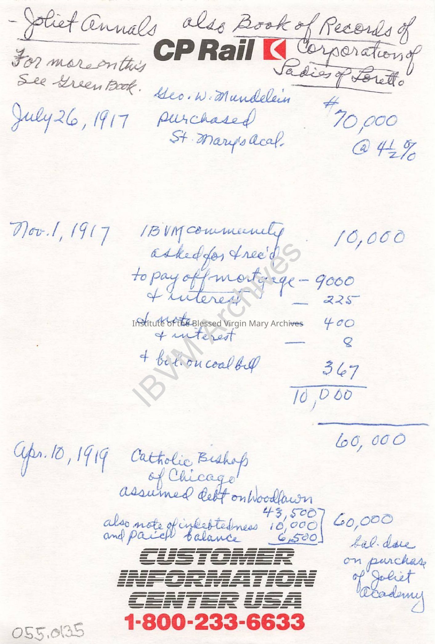 Handwritten research notes believed to have been compiled by Sister Miriam (Mary Clare) Mracek. They focus on finance and real estate transactions in Joliet and Woodlawn between 1917 and 1919. St. Mary's Academy in Joliet is mentioned.