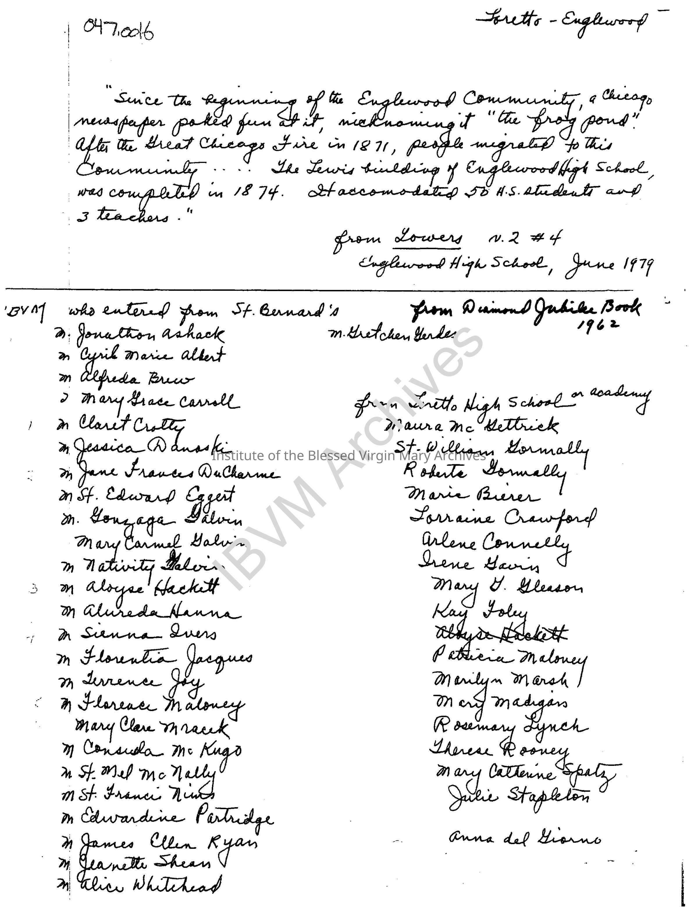 Notes discussing the history of Loretto Englewood. Topics include the Englewood community and IBVM Sisters who entered from St. Bernard and Loretto High School.