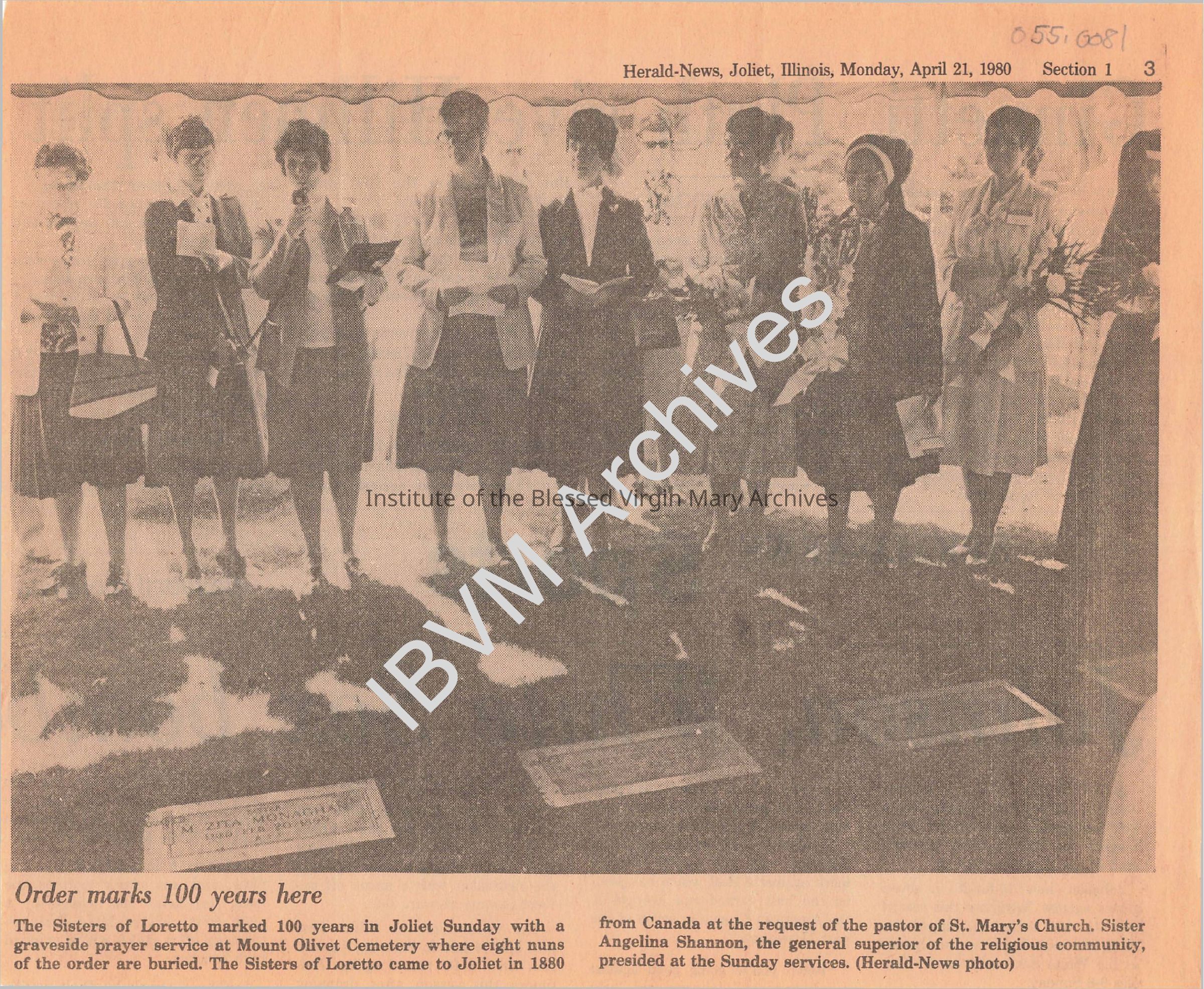 Joliet Herald-News article covering the one hundredth anniversary of the IBVM in the United States. It features a picture of IBVM Sisters attending a graveside prayer service at Mount Olivet Cemetery in Joliet. Sisters present include Sister Marie (Mary Stanislaus) Drummond, Sister Mary (Loretta) Keenan, Sister Angelina Shannon, Grace Creighton, Sister Marguerite (Fidelis) Caulfield, Sister Nancy (St. Edward) Kennelly, Sister Marilyn (St. Patrick) Marsh, Sister Lenore (Beata) Purpura, Sister Muriel (Concetta) Mauer, Sister Edna (Denise) Adams and Sister Patricia (Cyril) Maloney.