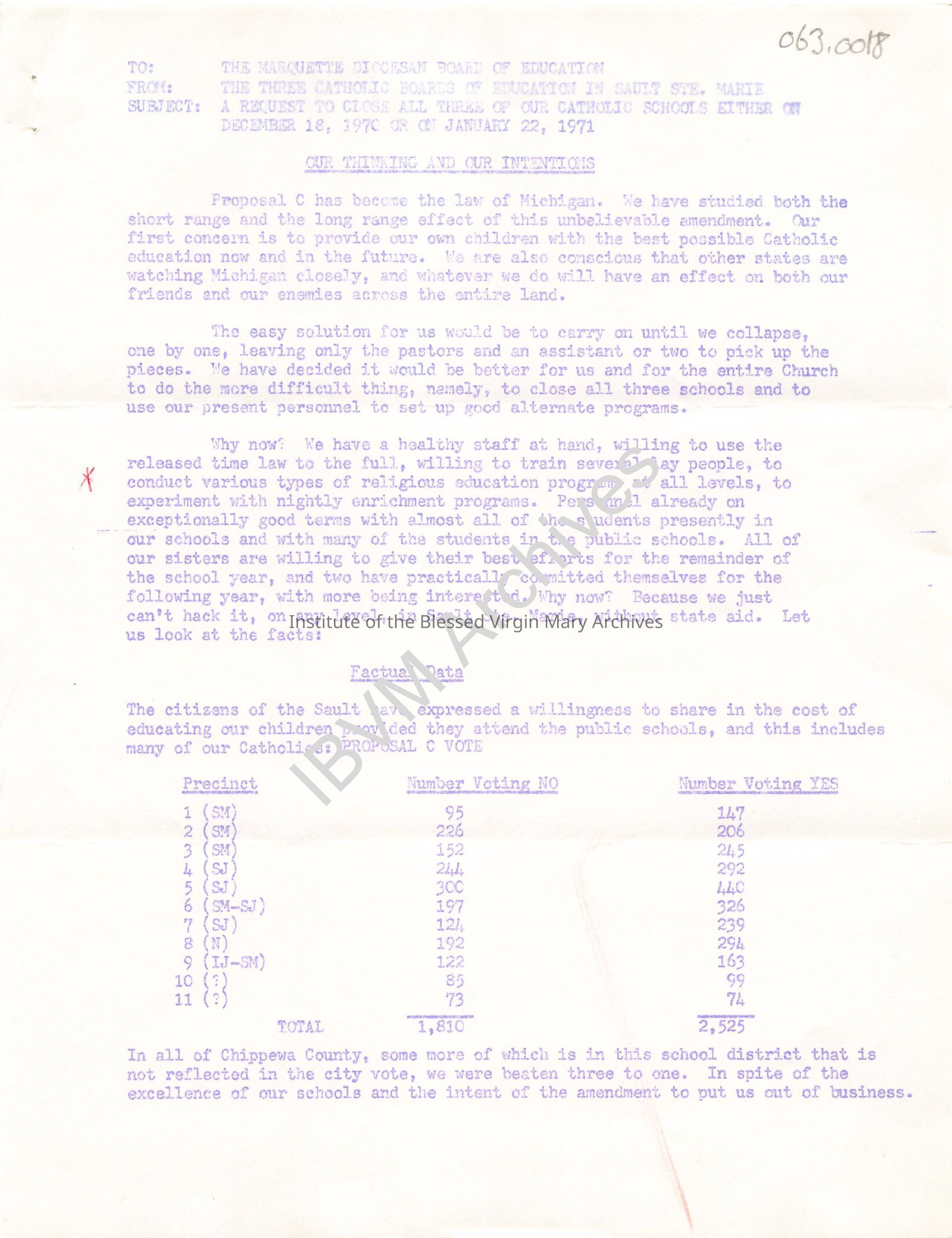 Request sent to the Marquette Diocesan Board of Education by the three Catholic Boards of Education in Sault Ste. Marie. As a result of the recently implemented Proposal C, it asks permission to close three Catholic schools in either late 1970 or early 1971. The document contains overall thoughts, vote totals, statistics, population trends, finances, budgets, observations, conclusions, the Sister's willingness to stay and more. The three schools discussed are St. Mary's, St. Joseph's and Loretto High School.