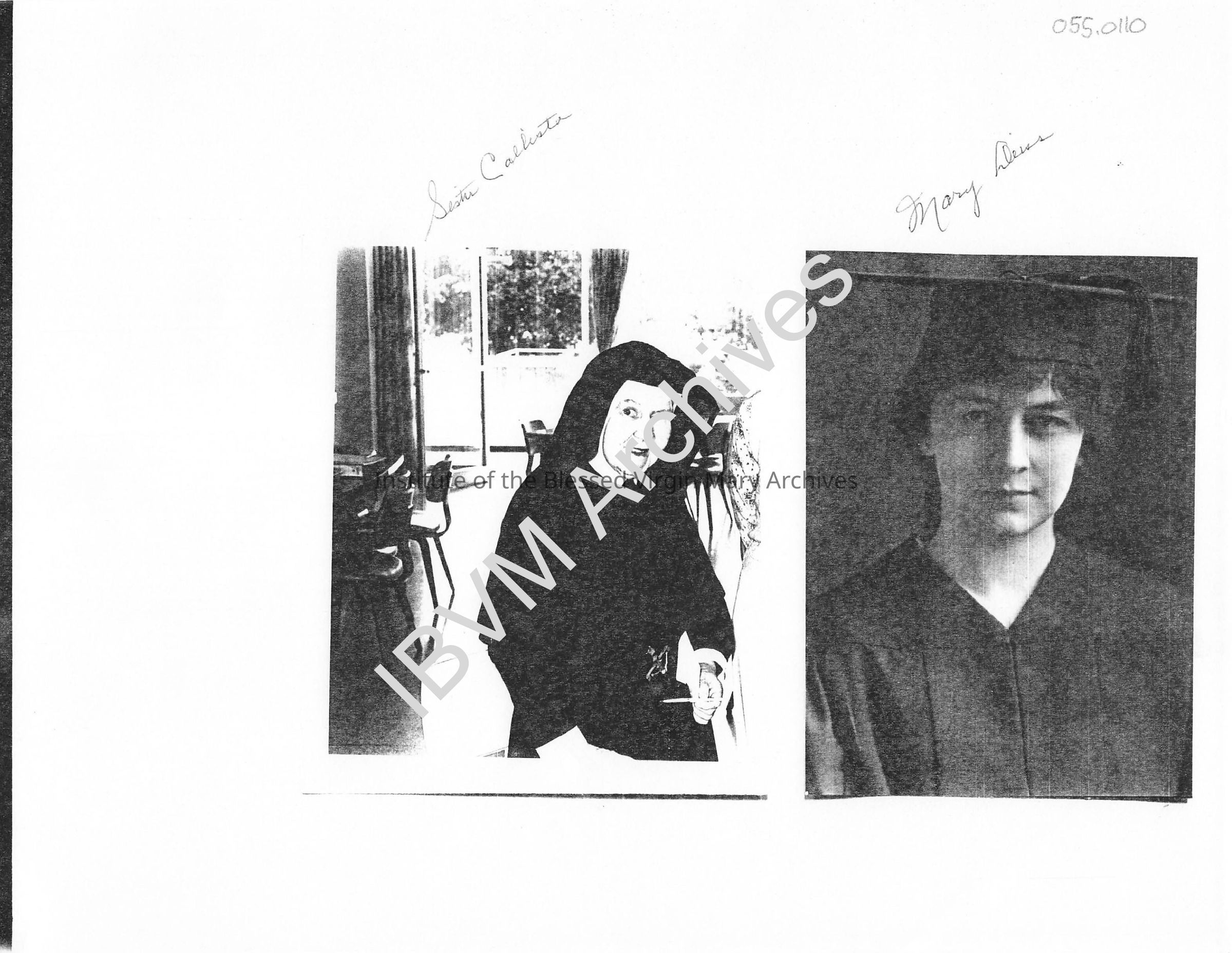 Sister Olive (Callista) McGuire and Mary Deiss. Sister McGuire graduated from St. Mary's Academy in 1907 and later joined the IBVM. Mary Deiss graduated from St. Mary's Academy in 1912 and was a lifelong supporter of the Sisters and their work.