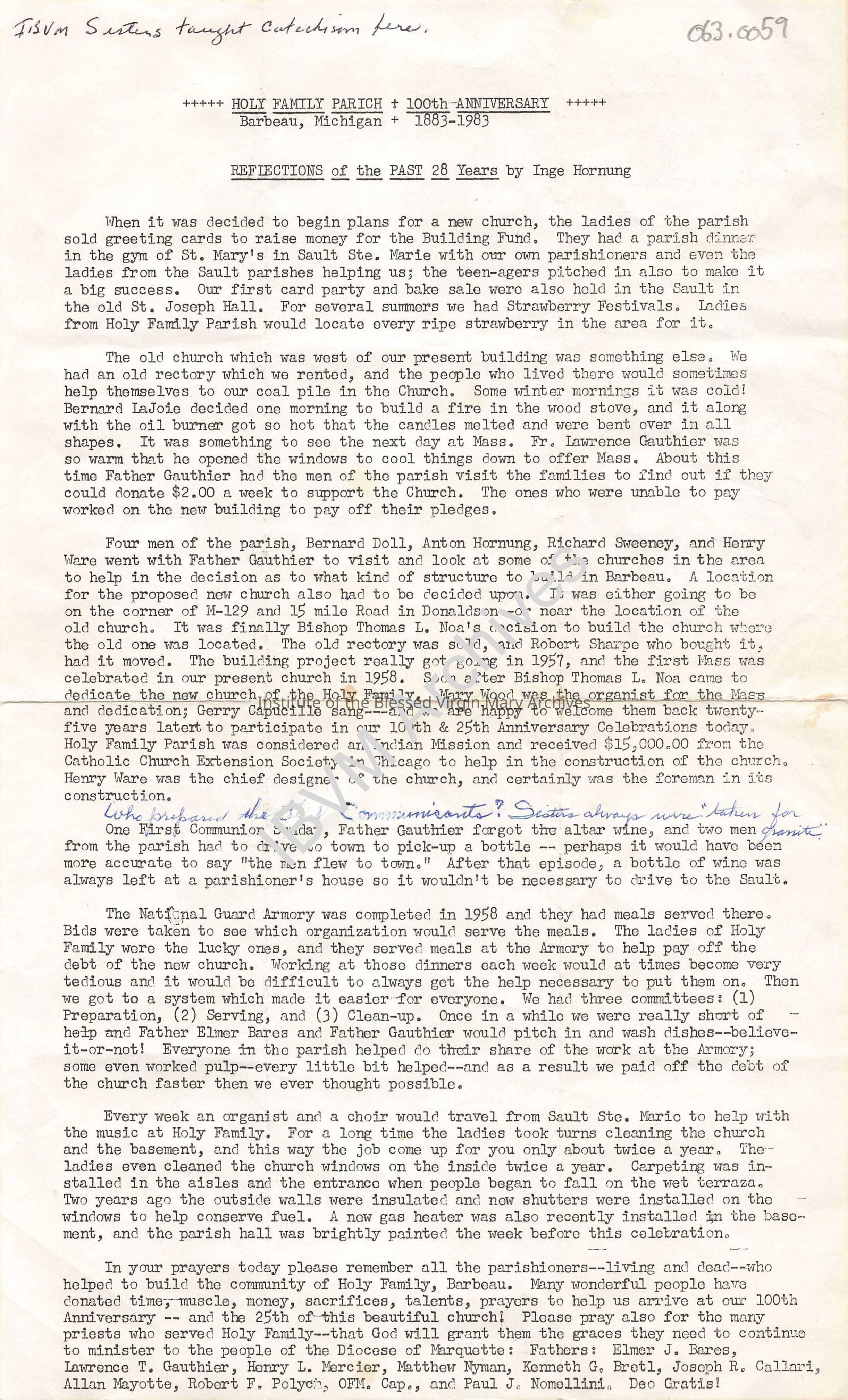 Newsletter from Holy Family Parish located in Barbeau, Michigan. It features an article titled "Reflections of the Past 28 Years" by Inge Hornung. A handwritten notation at the top states "IBVM Sisters taught Catechism here". In 1983, Holy Family Parish was celebrating it's 100th anniversary.