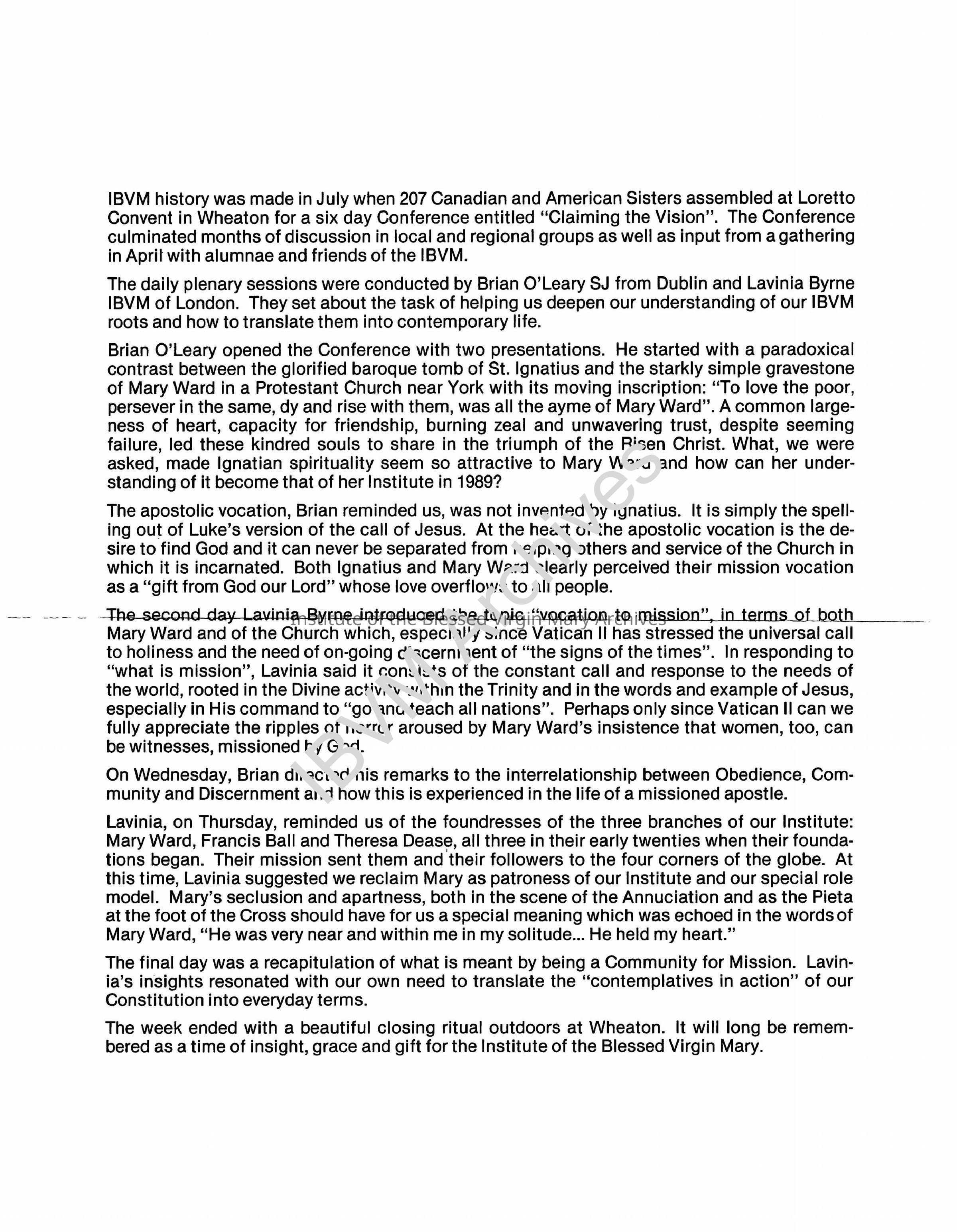 Report describing a six day conference titled "Claiming the Vision" held at the Loretto Convent in Wheaton, Illinois. It details different speakers and topics of discussion.