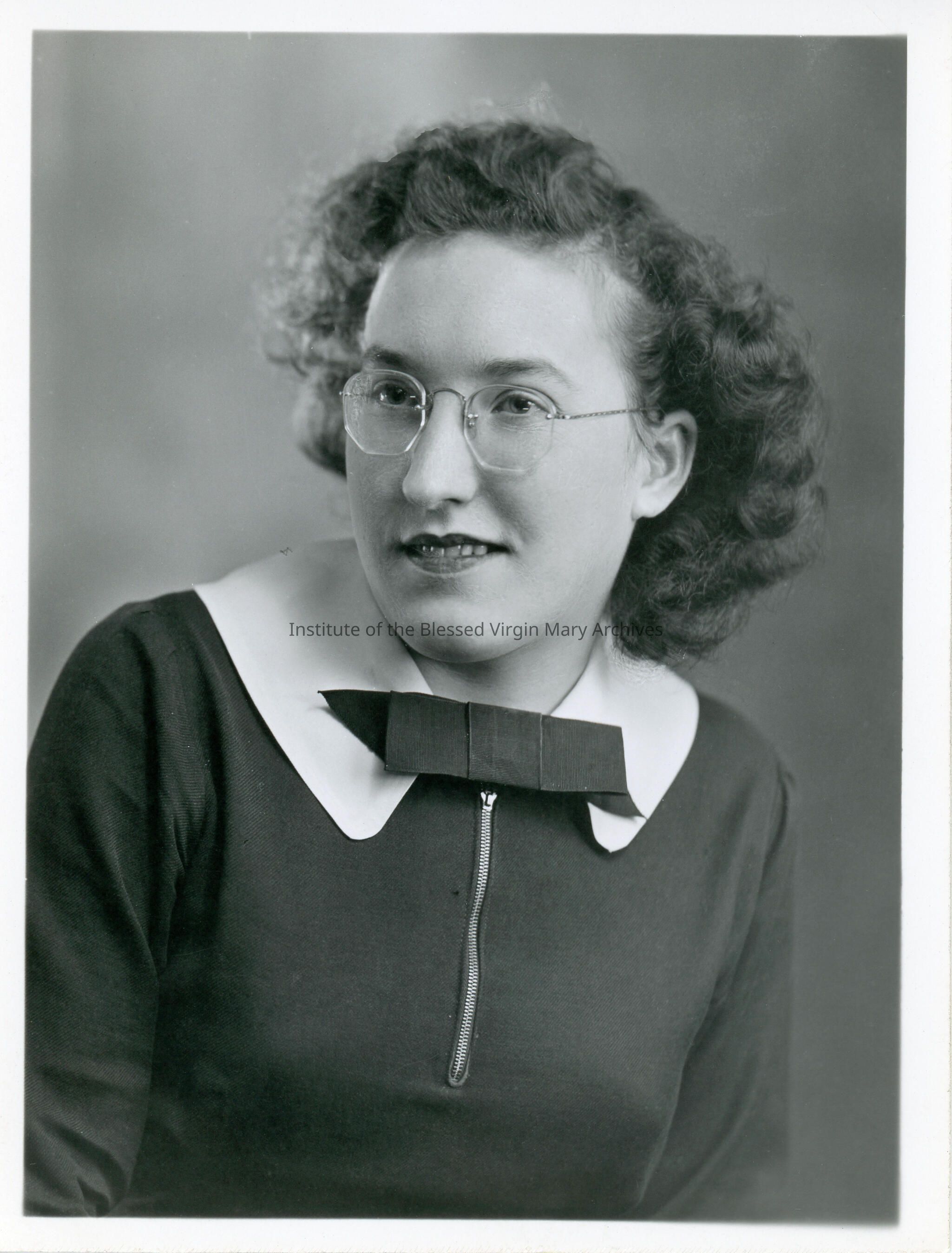 Portrait of Rita Myotte, a 1946 graduate of Loretto High School, formerly Loretto Academy, in Sault Ste. Marie. Founded in 1896, the academy's location at 377 Armory Place opened in 1899 and underwent a substantial addition in 1910. Converted into a co-ed high school in 1944, it was demolished in 1966 after Loretto Catholic Central High School was constructed.