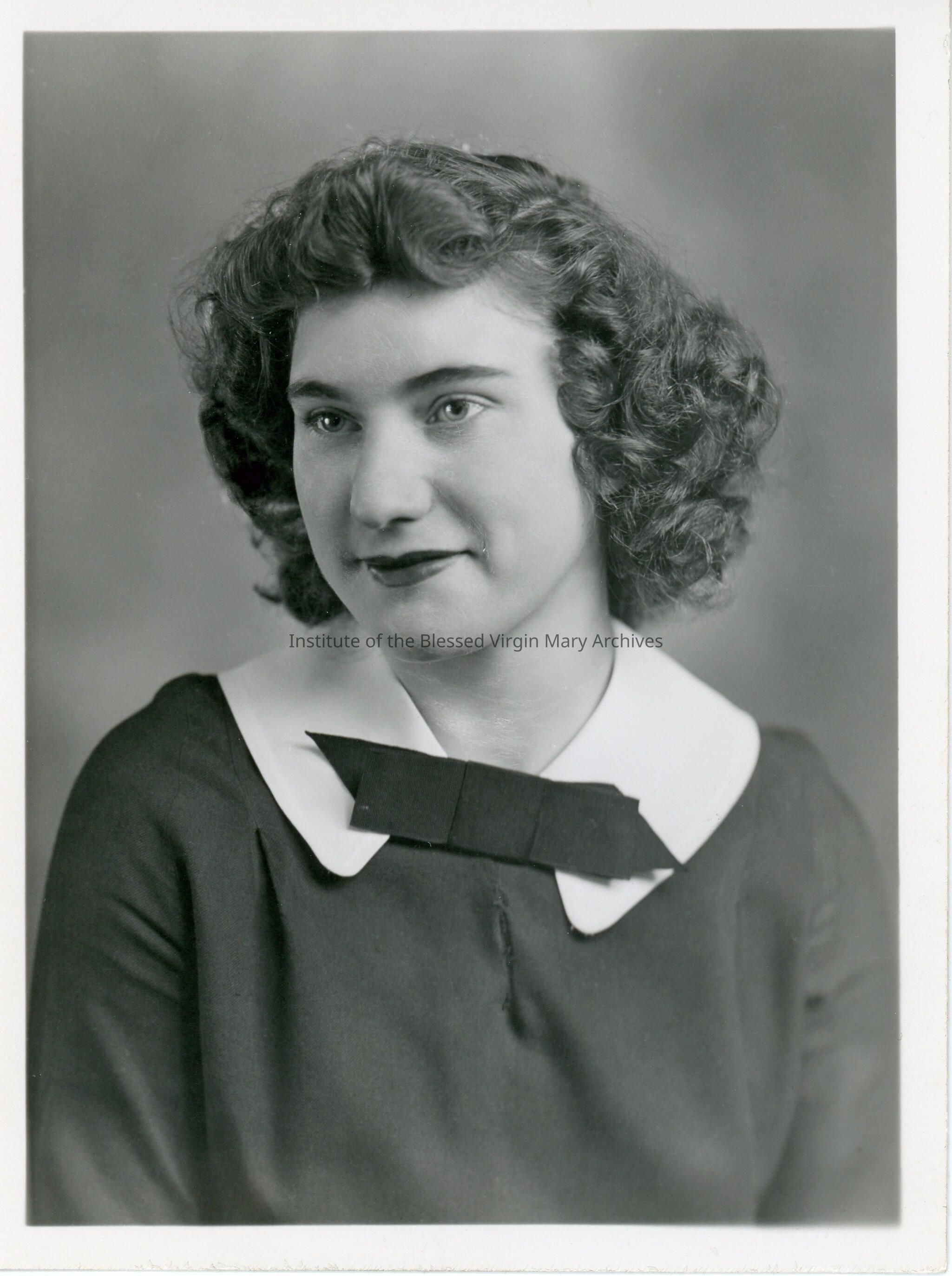 Portrait of Ruth Sylvester, a 1946 graduate of Loretto High School, formerly Loretto Academy, in Sault Ste. Marie. Founded in 1896, the academy's location at 377 Armory Place opened in 1899 and underwent a substantial addition in 1910. Converted into a co-ed high school in 1944, it was demolished in 1966 after Loretto Catholic Central High School was constructed.