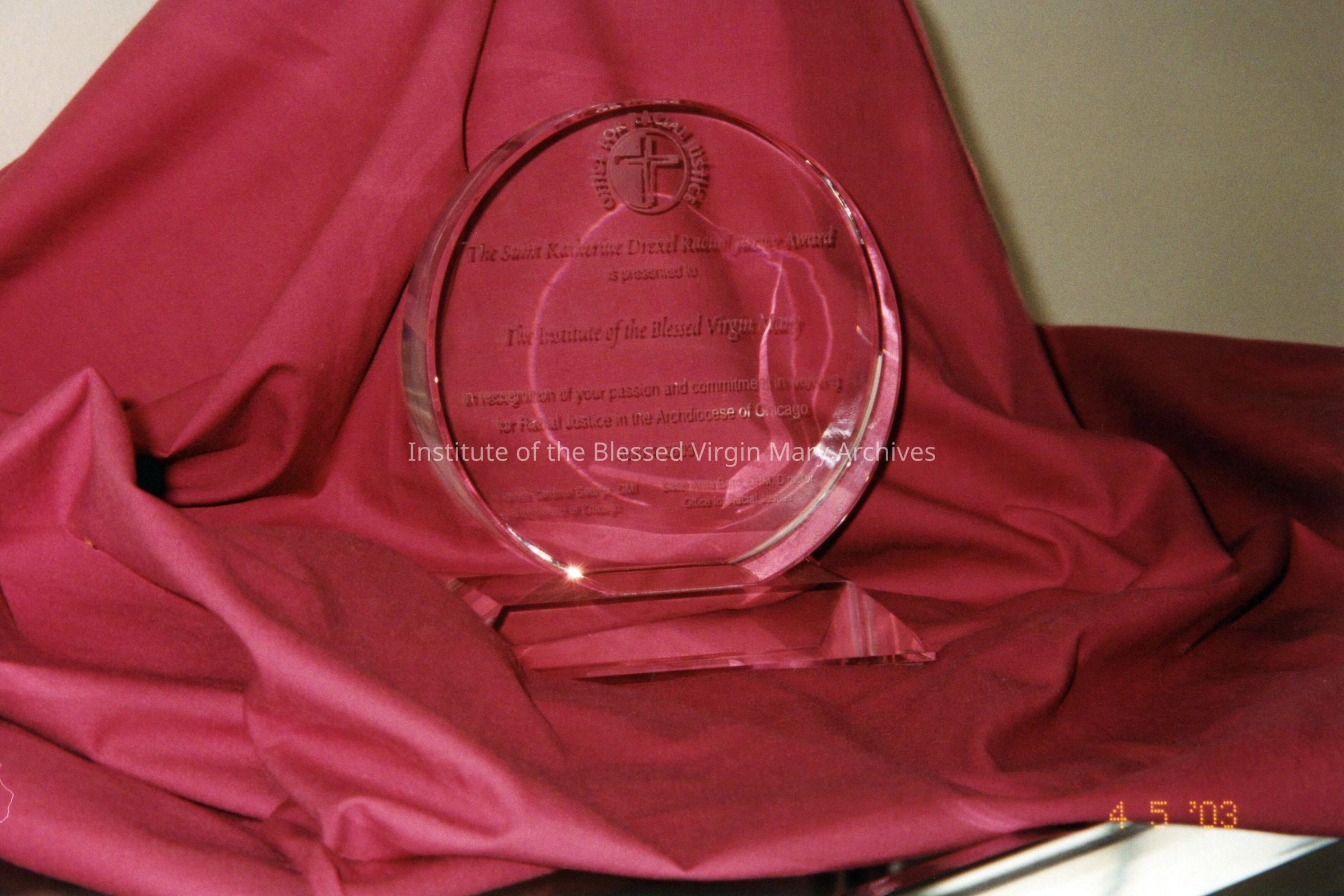 Saint Katherine Drexel Racial Justice Award given to IBVM Regional Superior Sister Ellen (Marie John) Enright. It was presented by the Archdiocese of Chicago's Office of Racial Justice in recognition of the IBVMs efforts integrating Loretto High School Woodlawn and the creation of the Loretto Adult Education Center. Founded in 1964, the LAEC program worked to improve literacy, provide job training and award high school diplomas to low income adults and young adults.