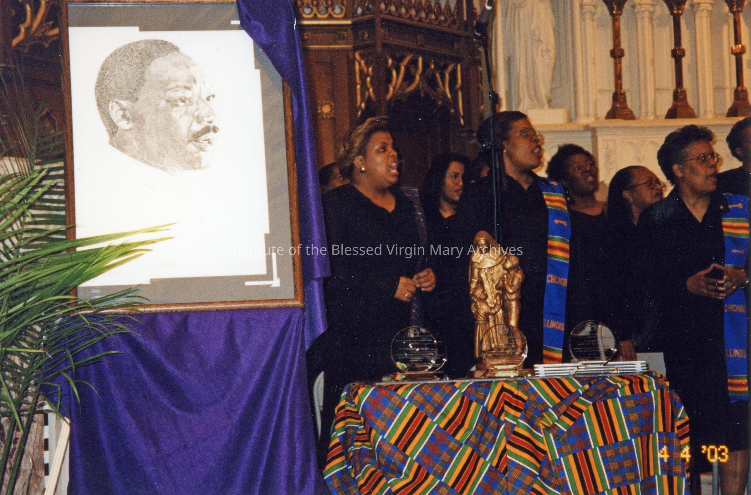 Saint Katherine Drexel Racial Justice Award Ceremony. This image features a choir singing near a drawing of Martin Luther King Jr. An award was presented by the Archdiocese of Chicago's Office of Racial Justice in recognition of the IBVMs efforts integrating Loretto High School Woodlawn and the creation of the Loretto Adult Education Center. Founded in 1964, the LAEC program worked to improve literacy, provide job training and award high school diplomas to low income adults and young adults.