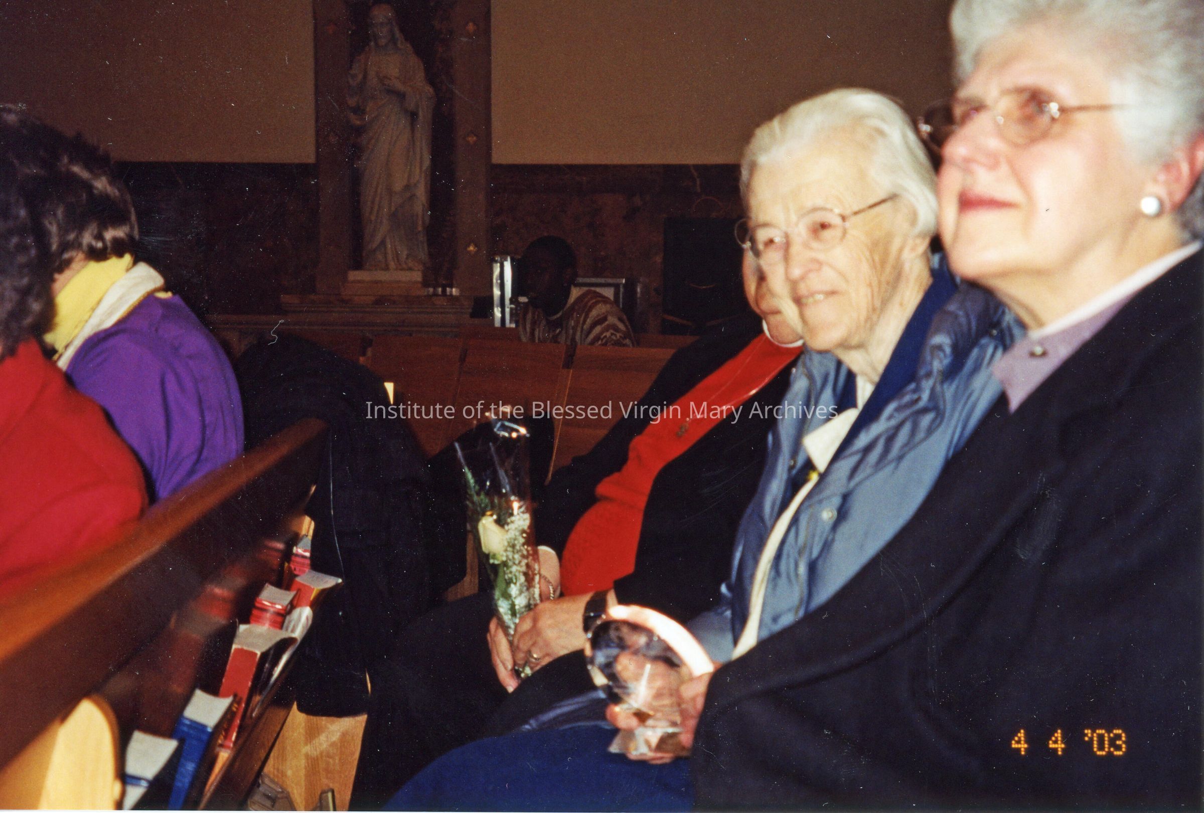 Saint Katherine Drexel Racial Justice Award Ceremony. From left to right are Sister Mary (Collette) Srill and Sister Anita (Anne) Hyzy. An award was presented by the Archdiocese of Chicago's Office of Racial Justice in recognition of the IBVMs efforts integrating Loretto High School Woodlawn and the creation of the Loretto Adult Education Center. Founded in 1964, the LAEC program worked to improve literacy, provide job training and award high school diplomas to low income adults and young adults.