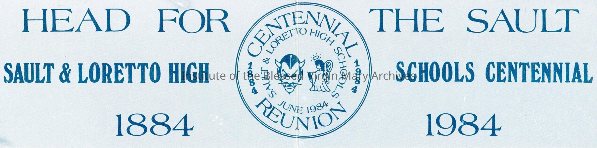 Bumper sticker from the Sault and Loretto High Schools Centennial Reunion in 1984.