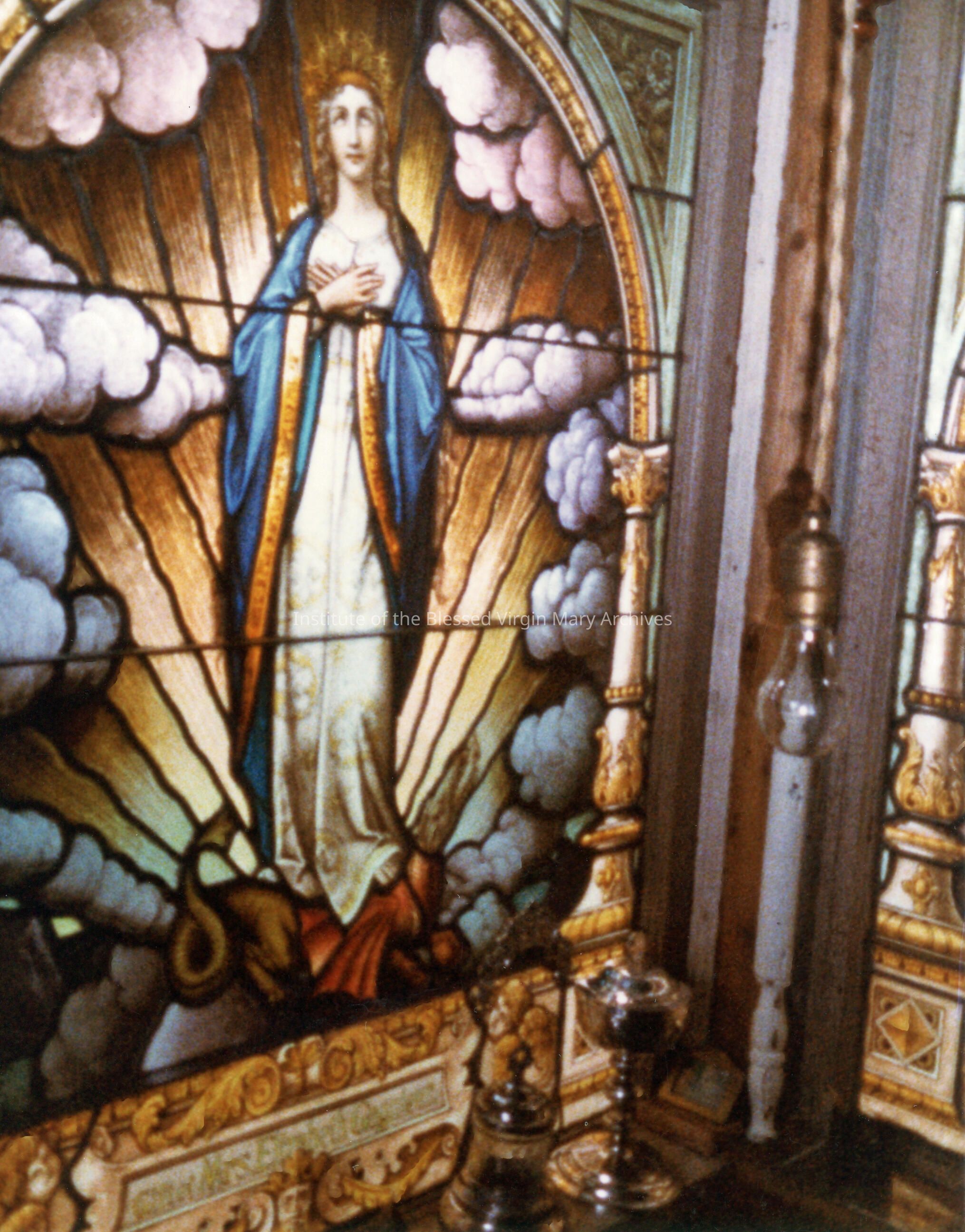 This image features a stained glass window taken from the former Loretto Convent at 377 Armory Place (Loretto Academy).