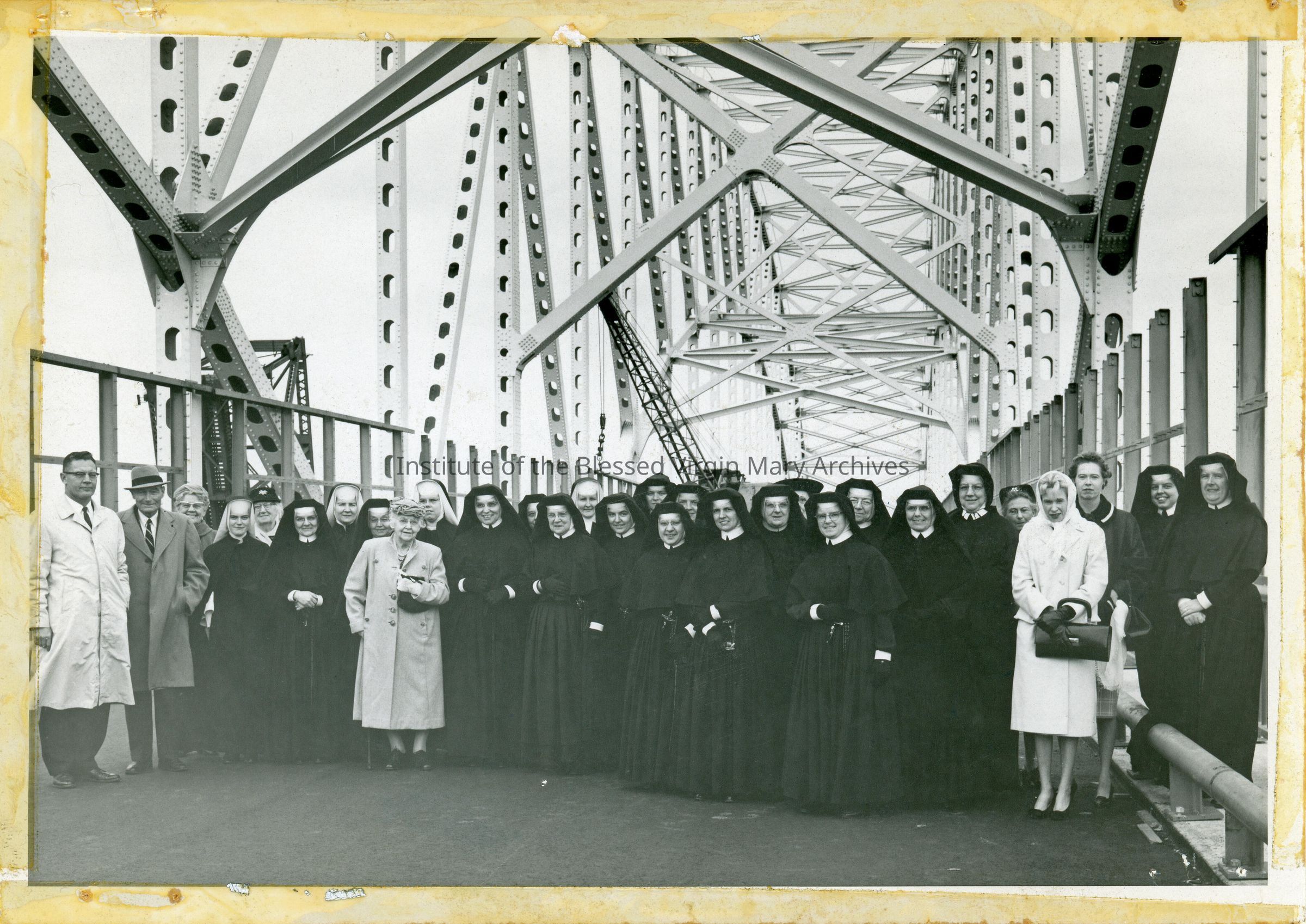 The completed Sault Ste. Marie International Bridge connecting the United States and Canada. There are a number of individuals, including IBVM Sisters, present. This image was taken eighteen days before the bridge was officially opened to the public.