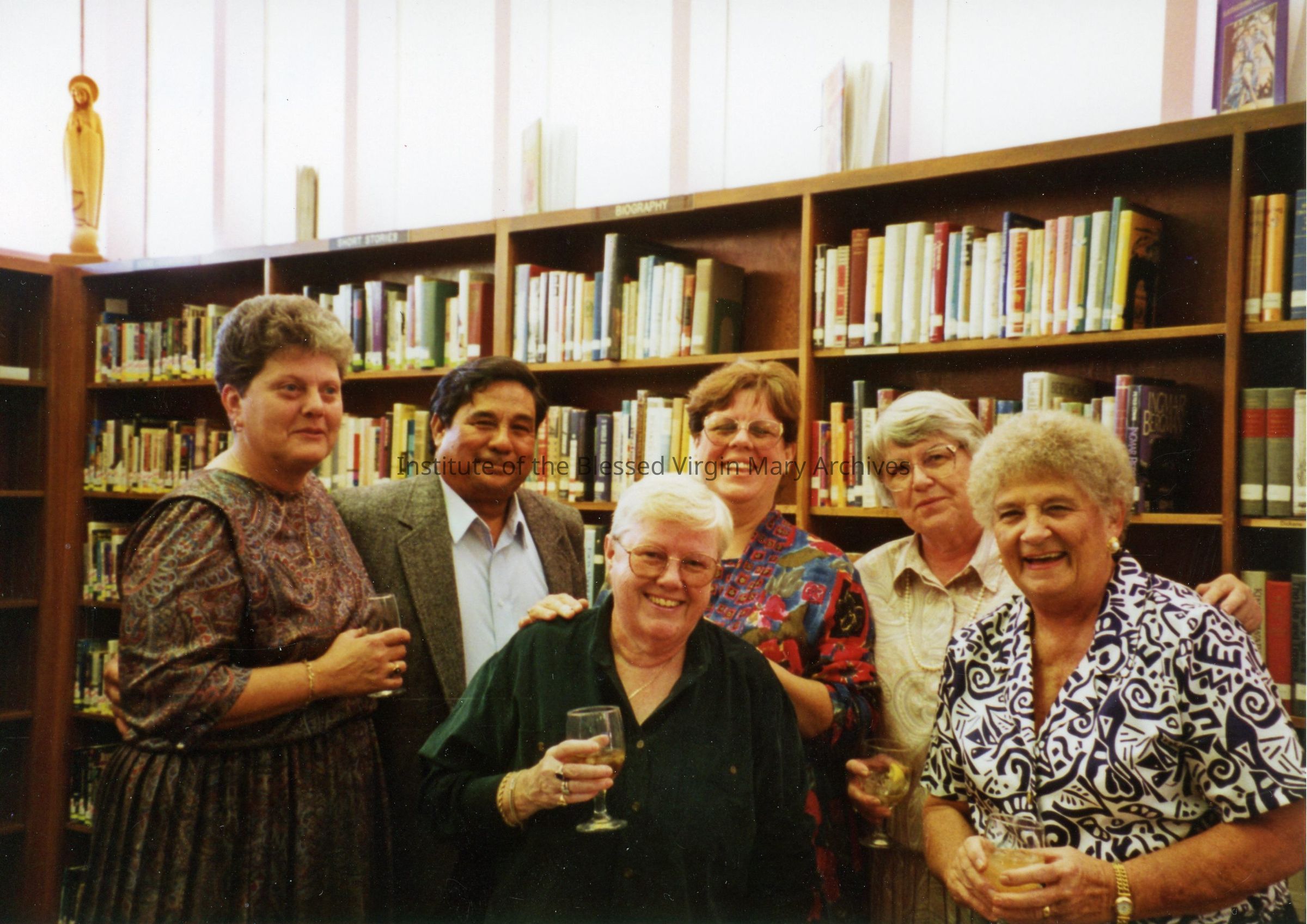 Gathering for Sister Margaret (Aileen) O'Connor and Sister Rita (Francis de Sales) Clarke. Sister Gail (Jane Patrice) McKirchy is in the back row, center, followed on the right by Geraldine Baskerville and Jackie Lane. This event commemorated Sister Margaret's 60th Jubilee and Sister Rita's 51st Jubilee. The celebration took place in the library at Loretto High School in Sacramento, California.